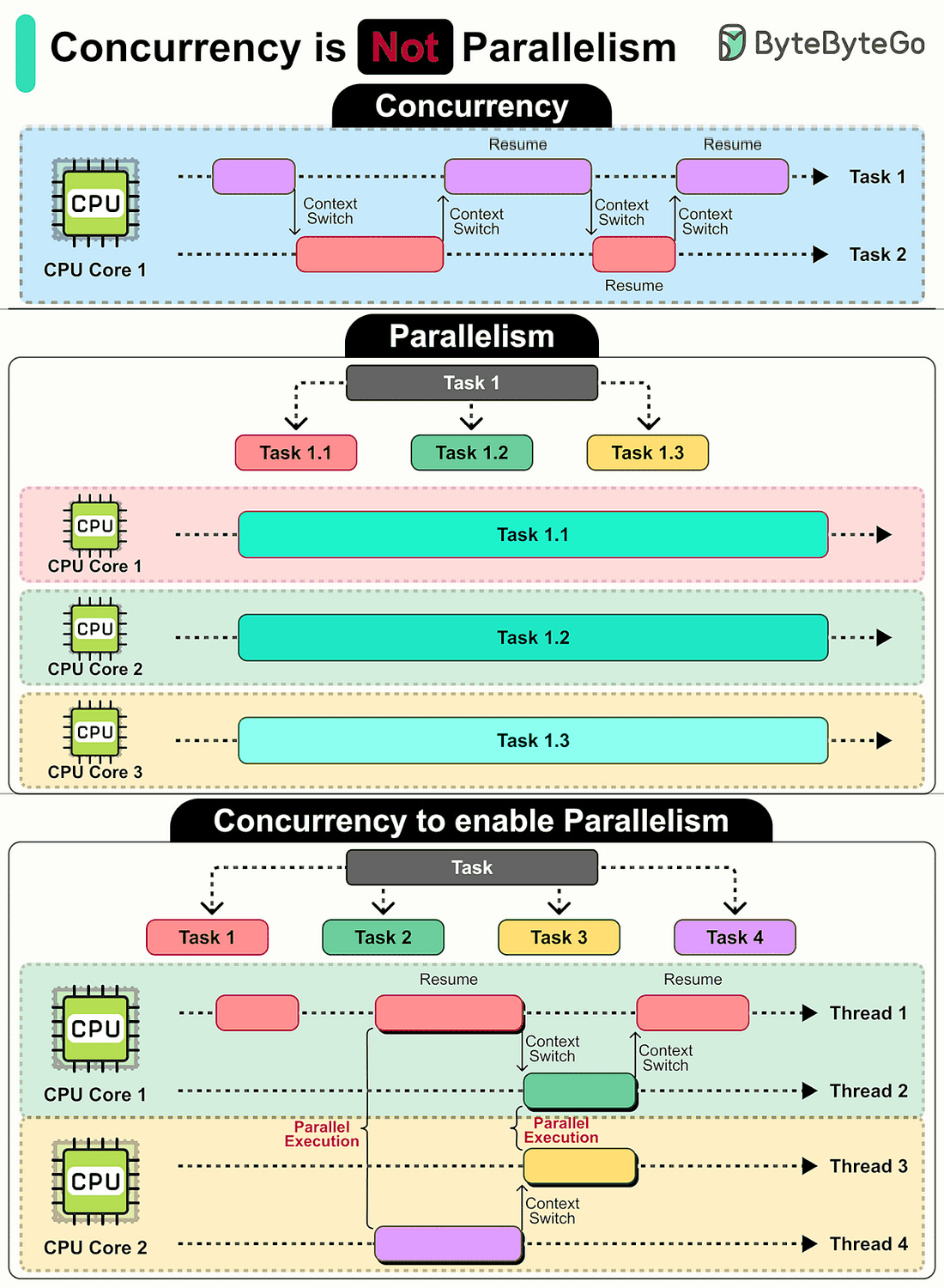 Over to you: Which layer do you think is the most underrated in modern software development? Data-in-Motion Transparency (Sponsored)Your backend makes thousands of encrypted connections daily. What sensitive data is flowing through them? Which processes are talking to which APIs? Traditional tools can't tell you without proxies, cert management, or performance hits. Qtap changes that. This lightweight eBPF agent gives you kernel-level visibility into all TLS/SSL traffic—showing you the actual unencrypted payloads, their originating processes, and full context. Zero performance impact. No code changes. Whether you're debugging API issues, auditing for sensitive data leaks, validating compliance, or investigating third-party integrations, Qtap illuminates what was invisible. Concurrency is NOT ParallelismConcurrency: It’s a design approach where tasks can start, run, and complete in overlapping periods, even on a single CPU core. It is about managing multiple tasks at the same time. The CPU rapidly switches between tasks (context switching), creating the illusion that tasks are progressing simultaneously, though they are not. Concurrency is great for tasks that involve waiting, like I/O operations. It allows other tasks to progress during the wait, improving overall efficiency. Parallelism: Refers to the simultaneous execution of multiple tasks, using multiple CPU cores. Parallelism excels at heavy computations like data analysis or rendering graphics, where tasks can be divided and run simultaneously on different cores. How They Work Together It's important to note that while concurrency and parallelism are different concepts, they are closely related. A well-designed concurrent program can scale to use multiple cores for parallelism when needed. By understanding the differences and interplay between concurrency and parallelism, we can design more efficient systems and create better-performing applications. Over to you: Have you encountered any challenges with concurrency or parallelism? Out Ship, Out Deliver, Out Perform. (Sponsored)DevStats helps engineering leaders unpack metrics, experience flow, and ship faster so every release drives real business impact. ✅ Spot bottlenecks before they stall delivery ✅ Tie dev work to business goals ✅ Ship more, miss less, prove your impact It’s time to ship more and make your impact impossible to ignore. JWT vs PASETO: The Two Players of Token-Based AuthenticationToken-based authentication has become quite popular over the years. Traditionally, JWTs have dominated this space. But now, a new player is making waves: PASETO, or Platform-Agnostic Security Tokens. So, what’s the difference between the two?