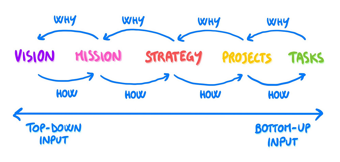 2) Goals 🎯Goals are measurable milestones that tell you that what you are doing is successful and goes in the right direction. If you want to reach 1M ARR over the next 6 months, that’s neither a strategy nor a project: it’s a goal. It’s one of the ways you measure progress. 3) Projects 🔨Projects (and tasks, and possibly levels in-between) live on the same imaginary line that answers “how?” when you go to the right, and “why?” when you go to the left 👇 All these concepts are important because they represent how the torch of your mission gets passed down to the work of individual teams and people. All the benefits we discussed, like purpose, alignment, and autonomy, are only possible when this link is clear, visible, and uninterrupted. But how does this look in practice? Let’s make it clearer with a detailed example: 🚆 Case study: WanderioWanderio has been my startup for 8 years. Our mission was to help people travel by comparing and booking all transports in one place, including flights, trains, buses, and more. We always believed in the power of travel as a way of connecting people (similarly to Airbnb), and we wanted to create a world where traveling is incredibly easy (vision): people should be able to book everything they need to go from A to B at the press of a button. At any given time, this mission had practical goals and targets attached, typically related to the next funding round: users, number of bookings, monthly growth, revenues. Now, to achieve this mission and make the product successful, we always had two main problems:
