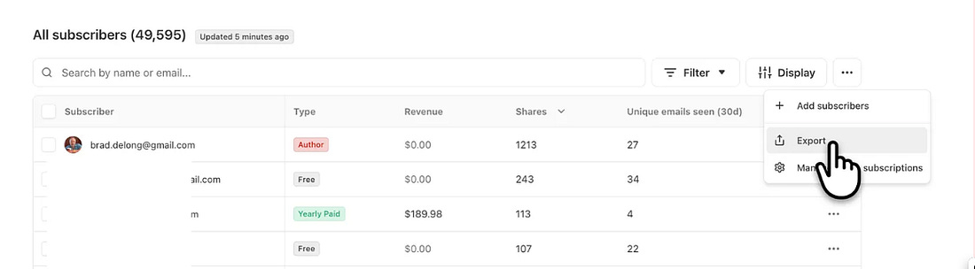 And, right now, if you have a SubStack, please: Go to: Settings → Subscribers → … → Export: Now you have your .csv file of subscribers: 2025-08-02-substack-subscribers-l5RQirajSomgmBDYk3GlJA.csv. You can then go to any other email-newsletter-website-archive host to import. Hook your Stripe account. Tell SubStack not to charge and Stripe not to pay SubStack 10%. And there you are. It would be wise to repeat this download every month, in case this option-to-export should someday vanish. You are not locked in. As Anil Dash writes: “the counter-argument… [of SubStack’s] convenience… I was more empathetic towards before great options like Ghost and Beehiiv and Medium even WordPress stepped up their game…”. Which they did. Once SubStack had pointed the way. (Which happened only after Ben Thompson with <http://stratechery.org> and PassPort had pointed the way first.) Except that you are locked in, as people like Taylor Lorenz and Laura Jedeed find, because then you lose the SubStack discoverability layer. My view: For most people, right now there is insufficient reason to incur the hassle-of-moving and loss-of-discoverability layer now, for SubStack remains, as Ana Marie Cox says, by far “the easiest way” to start and run a newsletter. And, on net, Chris, Hamish and company are undertaking a mitzvah. However, some people—smart people—deny that the discoverability layer is worth much at all: