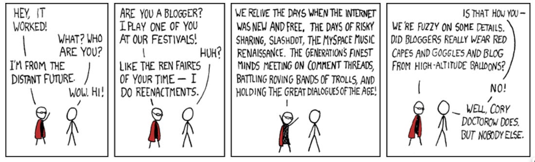 But I have seen no statistical evidence that they are right. I have a bunch of anecdotal stories that they are wrong, and that the discoverability layer is in fact worth a substantial amount. Look: I grok where they are coming from. What they want is a decentralized system of individual writers writing for occasions semi-regularly on their own websites, all linked together by discovering and referring and boosting one another as they argue and inform, and perhaps it will be a side-hustle for some and a source of resources to keep body-and-soul together for others. Well, so do I. I want that too. Lots of us who have been around this internet rodeo for a while want that too: But we have experience with this. Our experience with this has taught us that things with active discoverability-and-monetization layers—especially the clickbait attention-hacking advertising-supported ones—suck the life and energy out of the Open Web. Anil Dash, John Gruber, Ben Thompson, a number of others manage to make a good living at the weblogging-and-ancillary-services business. But they are few. More typical, I think, is an Ana Marie Cox, who we noted above writing that Patreon was the best of only a few bad options, and who we also find writing things like <https://newsletter.anamariecox.com/archive/substack-did-not-see-that-coming/>: