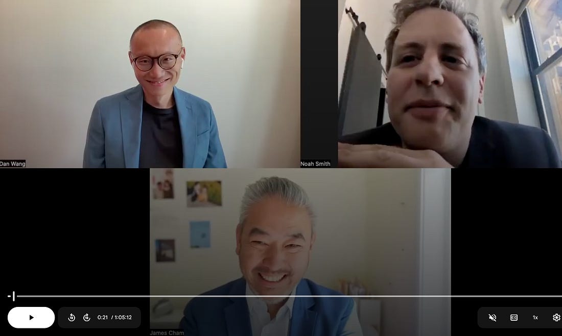 My friend Dan Wang's Breakneck: China's Quest to Engineer the Future is out this week. It launches Tuesday, August 26: <https://www.amazon.com/dp/1324106034/> <https://danwang.co/breakneck/>. Give a gift subscription I am biased, because he is my friend. However, you need to read it. I would say the same thing if I did not know him from Adam. And I am not alone: Tyler Cowen calls it "arguably the best book of the year". John Thornhill calls it "compelling, provocative and highly personal". Patrick Collison claims that it "illuminates China like no one else". Tracy Alloway calls him "one of the best China writers out there". Breakneck is Dan Wang’s sharp, lived account of a world with two dynamos: the “thrilling, maddening, and bizarre” engines of change that are China and the United States. Leave a comment James Cham and Noah Smith interviewed Dan about the book on a Bloomberg zoom last Friday. Below are my Chatham House-style notes on the conversation. But, first, let me transcribe the opening: