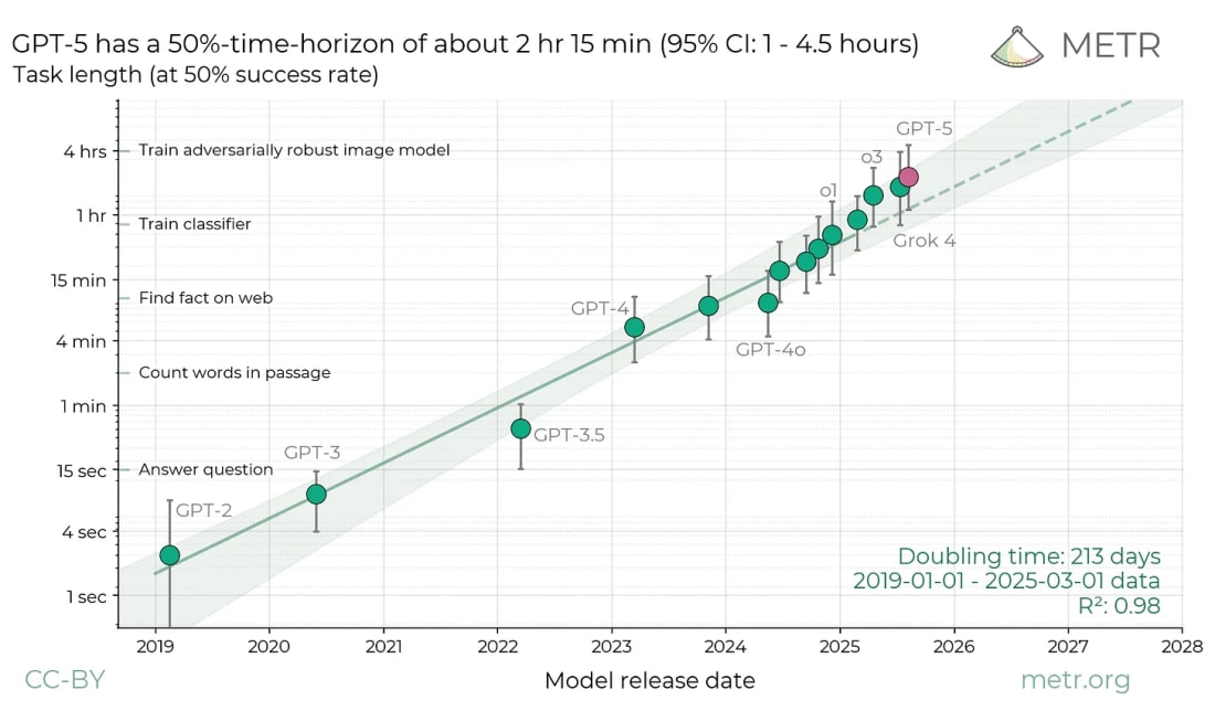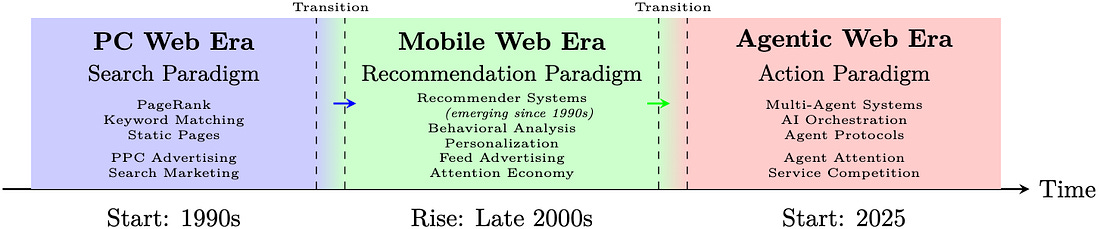 “Always insightful and refreshingly free of an agenda other than the intellectual pursuit of knowledge in how tech shapes our world.” – Vincent, a paying member Hi all, Welcome to our Sunday edition, where we explore the latest developments, ideas, and questions shaping the exponential economy. Enjoy the weekend reading! Azeem A new era of the WebThis week’s big news was the release of GPT-5 (my initial take here, quoted in the FT here), but something bigger is brewing beneath the surface: a fundamental transformation of how the Web itself operates. A paper I read this week takes stock of the transition from the recommendation paradigm to the action paradigm – a shift toward an agentic Web with fundamentally different incentive structures. Yang et al. outline three enablers of this change: intelligence, interaction and a nascent economy. The first two form a technical layer: agents that can reason and plan, and protocols that let them communicate. The intelligence pillar is progressing – models can handle longer tasks over time, although reliability remains a concern.