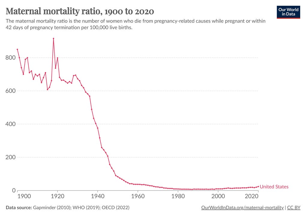 Embedded in these statements is the belief that the trials and challenges of the world are potentially impermanent; that rather than something to be endured again and again ad infinitum, they are something that can and should be conquered and put behind us forever. It’s the belief that with effort, we can create a durably better world. That’s not a trivial assumption. Humans have always dreamed of creating a better world, but for most of our history, the world stubbornly refused to get better at anything faster than a snail’s pace. A human in China or Europe or the Middle East in the year 1400 didn’t live a significantly better life than one in 400 B.C. Civilizations would rise, but then they would fall, smashed back to earth by something that looked suspiciously like a Malthusian ceiling. As a Frenchman in the year 1000 you could dream of creating God’s kingdom on Earth, but short of supernatural intervention, you could not reasonably dream of a world without smallpox, bedbugs, or senile erectile dysfunction. Then, of course, something changed. By now you’ve all seen the graph where world GDP creeps along and then explodes upward like a hockey stick; I won’t post it again. Instead I’ll post this one: For American women to die from pregnancy used to be a normal occurrence; then in the 1930s and 1940s it became an extreme rarity. Suddenly, a fundamental fact of human suffering that had stubbornly resisted change since time immemorial simply gave way. We fought and lost, and fought and lost, and then one day we fought and won. The proximate reason for the abrupt decline in maternal mortality was the invention of antibiotics in 1928, and the development of medical practices like blood transfusions whose safety depends on antibiotics. But although penicillin was discovered by accident, it didn’t simply appear out of nowhere; its discovery required the edifice of an industrial society that took centuries to build. The victory over maternal mortality was achieved by a long struggle, not by a happy accident. (In fact, in some countries, maternal mortality began to fall in the 1800s, thanks to the wealth created by industrialization.) A romantic could argue, if they were so inclined, that the conquest of maternal mortality has made the world a shallower place. In the early 1800s, you could tell stories whose emotional power rested — explicitly or silently — on the universal knowledge that childbirth meant mortal danger. Today, our high school English teachers have to explain this to us when we read Jane Austen or Emily Brontë, just so we understand, on an intellectual level, how brave the women in their novels were. Such conquests have become commonplace. HIV was a death sentence in 1995; the next year, David Ho and his team unveiled a new combination drug therapy that turned it into a manageable chronic disease. And now, almost three decades later, Unfinished Painting is already becoming something that most people need explained to them; we still understand the meaning of terminal disease, but the context of AIDS, and especially what it meant to gay people in the political climate of the 1980s, is already fading from living memory into dry history. As the world becomes safer — as one after another edifice of human suffering crumbles before the collective might of science, technology, and industrial society — it becomes harder to harness the emotional power of tragedy, risk, adversity, and heroism. The lives of more individuals become childlike, pure, and unmarked — or at least a little bit more so than before. I first realized this years ago, while watching Disney’s The Little Mermaid. In the original 1837 Danish fairy tale, the mermaid wagers her life on a chance to win the love of a prince; she fails, and her life is forfeit to the evil sea witch. In the 1989 Disney movie, the same exact thing happens — except instead of passively accepting defeat, the mermaid and the prince simply stab the sea witch in the chest with the broken prow of a ship, and live happily ever after. Perhaps this is the kind of resolution that could only feel natural and satisfying in America, a country that grew up after the Industrial Revolution. Some call Hollywood endings shallow, but they reflect our everyday reality in the modern world; what is David Ho’s defeat of AIDS, but the stabbing of an evil sea witch in the chest? Nor, I think, are we simply on a temporary upswing. Some romanticists imagine that society is a cycle, where hard times create strong men, who create good times, which creates weak men, who create hard times. But whether or not that sort of institutional cycle exists, the technologies discovered during the last upswing will be preserved. Countries may collapse, but humanity will not forget antibiotics. Nor is there any sign that this process will be naturally limited by humans’ inability to appreciate the improvements in their material lives. There is no upper limit on the correlation between life satisfaction and GDP. Contrary to popular myth, suicide rates tend strongly to fall as countries become richer. The higher measured rate of depression in developed nations is likely due not to ennui, but to better diagnosis. Some romanticists feel the urge to knock over the edifice of industrial society intentionally, in order to kick against the seeming shallowness of modern life — to return humanity to a world of toil and struggle, in order to ennoble us. But these dark romantics are rightfully recognized in fiction and public discourse as villains. The heroes of our stories are the people like David Ho — the ones who fought to hoist humanity up from the muck so that future generations could be a little more childlike, the ones who studied politics and war so that our grandchildren may study statuary, tapestry, and porcelain. Romanticists need to accept that the nobility of suffering has always been a coping mechanism — a way to sustain hope through the long 