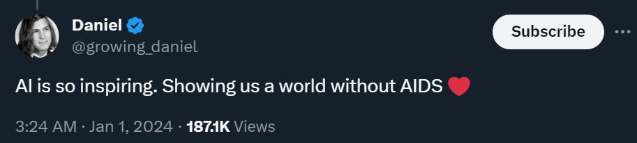 A lot of people on X got mad at this, calling it “eugenics”, claiming that it invalidated the life of people born with genetic disorders, and generally saying that Noor’s vision of healthy babies is dystopian. The argument reminded me of one of my favorite essays that I’ve ever written — my New Year’s post in January 2024. It was about how lots of people have the instinct to value human suffering, and to disdain technological solutions that make the struggles of the past obsolete. I thought I’d repost it, because I think it applies to the controversy over embryo screening as well. “I would love to live to be 50 years old.” — Keith Haring Yes, this post starts with the latest ridiculous contretemps on the social media platform formerly known as Twitter. But I promise, it gets more interesting! The latest contretemps revolves around a famous painting: Keith Haring’s Unfinished Painting. Painted in 1989, it represented the artist’s impending death from AIDS. Haring died the following year, at the age of 31.
