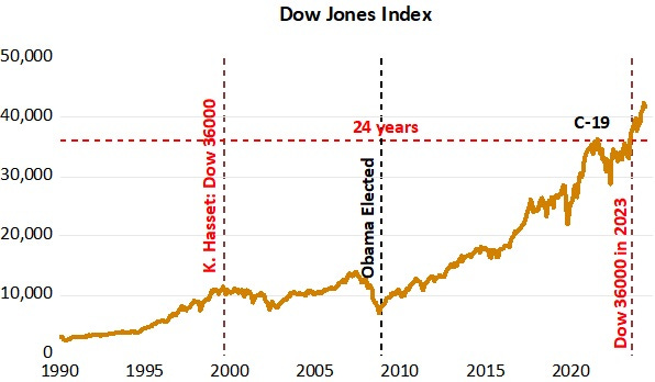 That was the title of their book: Dow 36,000: The New Strategy for Profiting from the Coming Rise in the Stock Market <https://www.amazon.com/Dow-36-000-Strategy-Profiting/dp/0609806998>. That was their claim: "our analysis justifies a Dow of about 36,000—not in five or 10 years, but right now." (Relative to inflation, a DJIA of 36000 in 1998 corresponds to 72000 today; relative to the size of the economy, A DJIA of 36000 in 1998 corresponds to 108000 today; relative to corporate profits, a DJIA of 36000 corresponds to 180000 today. The DJIA this AM is one quarter of that, just as the DJIA back in 1998 was 1/4 of what it was then. The Glassman-Hassett valuation claims were off by a factor of four then. Their methodology is still off by a factor of four now.) Of course it did not happen. If you had bought the Dow at 9000, and if you were forced by liquidity to sell at the trough over the next half-decade, you did not quadruple but instead lost 20% of your money. If you had been unlucky enough to buy at the peak and be forced by liquidity to sell at the trough, you lost 40%. When challenged by people who said that their math seemed, wrong, Glassman attempted a partial walk-back: