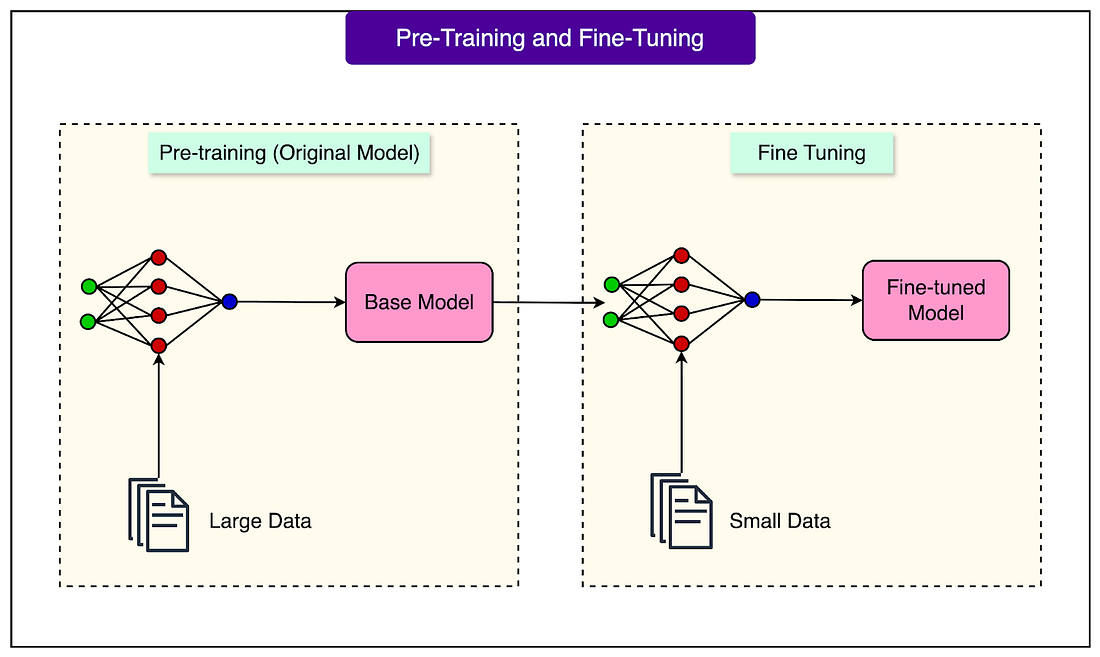 See why Warp is trusted by over 700k developers → use code BYTEBYTEGO for a month of Warp Pro for just $1. Understanding the Foundation: Pre-trained ModelsPre-training is the foundational education that large language models receive before they become useful for any specific task. Think of it as providing a comprehensive general education, similar to how students spend years learning mathematics, science, language, and history before specializing in a particular field. During pre-training, models learn language patterns, facts about the world, reasoning abilities, and how to generate coherent text by processing enormous amounts of text from books, websites, academic papers, and other sources. See the diagram below: The scale of pre-training is staggering. Training a model like GPT-3 reportedly costs over $4 million in computational resources alone. The process requires thousands of specialized processors running continuously for months, consuming enough electricity to power hundreds of homes for a year. These models train on datasets containing hundreds of billions of words, essentially reading more text than a human could consume in thousands of lifetimes. This massive investment creates models that understand language structure, can answer questions about diverse topics, and generate human-like text. We start with pre-trained models because this foundational knowledge is incredibly valuable and expensive to replicate. It would be wasteful for every organization to spend millions creating its own language model from scratch when it can build upon existing ones. However, this creates a challenge. Pre-trained models are impressive generalists but mediocre specialists. For example, GPT-4 can discuss medicine because it has read medical texts, but it wasn't optimized for medical consultation. It might confidently discuss symptoms, but it lacks the careful diagnostic approach a medical AI should have. Similarly, it knows legal terminology but might not structure arguments the way a legal assistant should. These models need additional training to transform their broad knowledge into specialized expertise, which is where fine-tuning becomes essential. The Mechanics of Fine-TuningTo understand fine-tuning, we need to grasp what neural network weights are. Weights are simply numbers that represent connection strengths between different parts of the model. Imagine an orchestra where each musician's volume knob affects the final sound. Some instruments need to be louder for jazz, others for classical music. Similarly, a language model has billions of these "volume knobs" (weights) that determine how it processes and generates text. Each weight is just a decimal number like 0.7 or -2.3, and the model's behavior emerges from billions of these numbers working together. Fine-tuning adjusts these weights to change the model's behavior. Think of it like seasoning a dish that's already cooked. We are not starting from raw ingredients, but taking something already good and adjusting it for a specific taste. During fine-tuning, we show the model examples of specialized behavior, and it slightly adjusts its weights to match these examples better. See the diagram below: Let's look at a concrete example. Consider how the model interprets the word "function" before and after fine-tuning for coding tasks. Initially, when the model sees "function," its weights might strongly connect to various meanings: