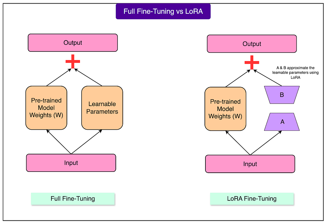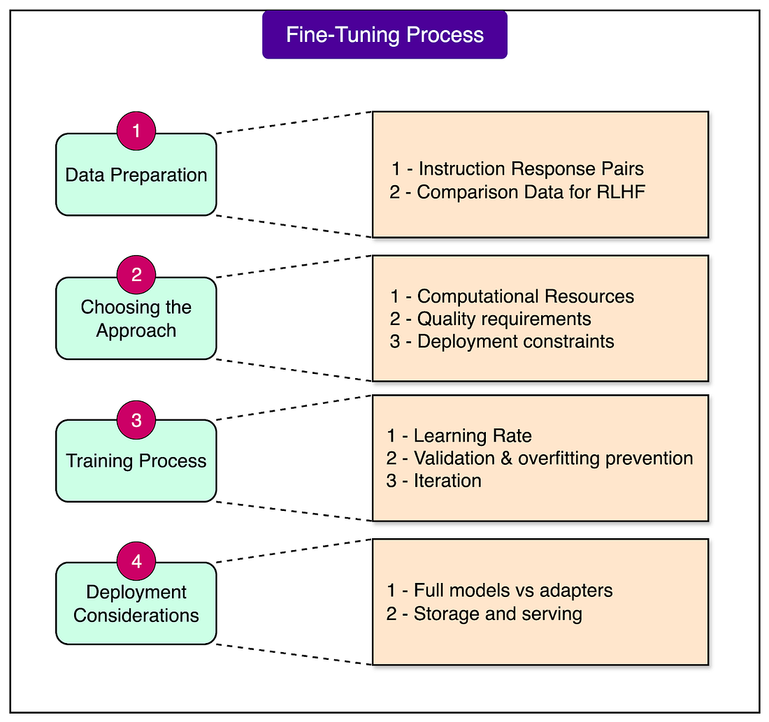 This type of fine-tuning is about shifting the entire context of understanding. LoRA and Its VariantsTraditional fine-tuning faces a fundamental problem: it's prohibitively expensive for most organizations. Fine-tuning a 70-billion-parameter model requires multiple high-end GPUs costing tens of thousands of dollars. The memory requirements alone can exceed 500GB, and training can cost thousands of dollars in cloud computing fees. This created a situation where only well-funded companies could customize large language models, leaving smaller organizations and researchers behind. LoRA (Low-Rank Adaptation) changed this landscape dramatically. Instead of updating all billions of parameters in a model, LoRA adds small, trainable components that modify the model's behavior. Imagine a massive general library with 10 million books. We want to customize this library for medical students. Traditional fine-tuning would require editing every single book, an enormous undertaking. That would take forever and cost a fortune. However, LoRA is like adding sticky notes to the most important pages. These notes guide how you read the books in a medical-specialized approach without rewriting them. The original books remain unchanged, but your reading experience is transformed by these strategic additions. The technical innovation behind LoRA is recognizing that most fine-tuning changes follow patterns. Rather than randomly adjusting millions of weights, the changes often have a simple underlying structure. LoRA captures this structure using two small matrices that work together. As a simple example, think of it like describing the difference between British and American English. We could list every single word that differs, creating a massive dictionary, or we could write a few simple rules like "remove 'u' from words ending in 'our'" and "change 'ise' to 'ize'." LoRA finds these "rules" for adapting model behavior. The efficiency gains are staggering. Where traditional fine-tuning might update 70 billion parameters, LoRA might update only 50 million, less than 0.1% of the total. Despite this massive reduction, the performance often matches or comes very close to full fine-tuning. Memory requirements drop from 500GB to perhaps 20GB, training time reduces from weeks to hours, and costs plummet from thousands to tens of dollars. QLoRAQLoRA pushes efficiency even further by combining LoRA with quantization. Quantization compresses the model by reducing the precision of numbers. Normal weights might be stored as 32-bit numbers that can represent values like 0.123456789, but quantization reduces these to 4-bit numbers that might only represent 0.12. It's like compressing a high-resolution photo to a smaller file size. We lose some detail but retain the essential information. QLoRA keeps the main model compressed to 4-bit precision while maintaining the LoRA adapters at full precision. The model temporarily decompresses relevant sections when needed, adds the high-precision LoRA adjustments, and produces output. This is like having a ZIP file of that massive library, unzipping just the book you need, adding your sticky notes, and then compressing it back. The practical impact of this cannot be overstated. Just for reference, a model that may require a $30,000 server with specialized AI accelerators can now be fine-tuned on a $2,000 gaming computer with a consumer graphics card. QLoRA can enable fine-tuning a 65-billion-parameter model on a single GPU with 24GB of memory, hardware that many enthusiasts already own. This isn't just about cost savings, but also about accessibility. Researchers at small universities, developers at startups, and even hobbyists can now experiment with customizing large language models. DoRAThe innovation continues with newer variants like DoRA. DoRA (Weight-Decomposed Low-Rank Adaptation) is a newer variant that came from an observation about how LoRA changes weights. Imagine we’re adjusting the trajectory of a spacecraft. We could change both its speed and direction at once, or we could separate these concerns: first adjust the direction it's pointing, then adjust how fast it's going. DoRA takes this second approach. In regular LoRA, when we adjust weights, we're changing both their "direction" (what patterns they recognize) and "magnitude" (how strongly they respond). DoRA separates these two types of changes. It uses LoRA-style updates for direction changes but handles magnitude changes differently. This separation turns out to be more efficient. DoRA often achieves better results than LoRA with the same number of parameters, or similar results with fewer parameters. The Fine-Tuning ProcessSuccessfully fine-tuning a model requires careful planning and execution across several stages. Understanding this process helps you avoid common pitfalls and make informed decisions that align with your goals and constraints. 1 - Data PreparationData Preparation is the foundation of successful fine-tuning, where quality matters far more than quantity. A carefully curated dataset of 1,000 high-quality examples often outperforms 100,000 noisy ones. For instruction fine-tuning, we need instruction-response pairs that clearly demonstrate the behavior you want. Each example should show the model exactly how to respond to specific types of requests. If we’re building a customer service bot, the data might include real customer questions paired with ideal agent responses. For RLHF, you need comparison data where multiple responses to the same prompt are ranked by quality. This requires human reviewers to evaluate responses, making it more labor-intensive but ultimately producing models that better align with human preferences. 2 - Choosing the ApproachChoosing Your Approach depends on three key factors.