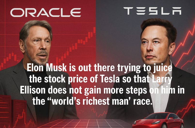 Briefly: Larry Ellison’s wealth climb reflects a simple thesis: Oracle now sits downstream of the AI gold rush, supplying the infrastructure that wins whether OpenAI soars, muddles, or stalls. By contrast, Elon Musk’s recovery looks more like bubble-time positive-feedback trading attempted front-running market plumbing: call-buying, hedging, and a desire to float Tesla’s price up into November’s shareholder-and-board vorte moment. The result is a richest-man relay: capex-linked cash flows on one side, and internet-age speculative dynamics on the other.