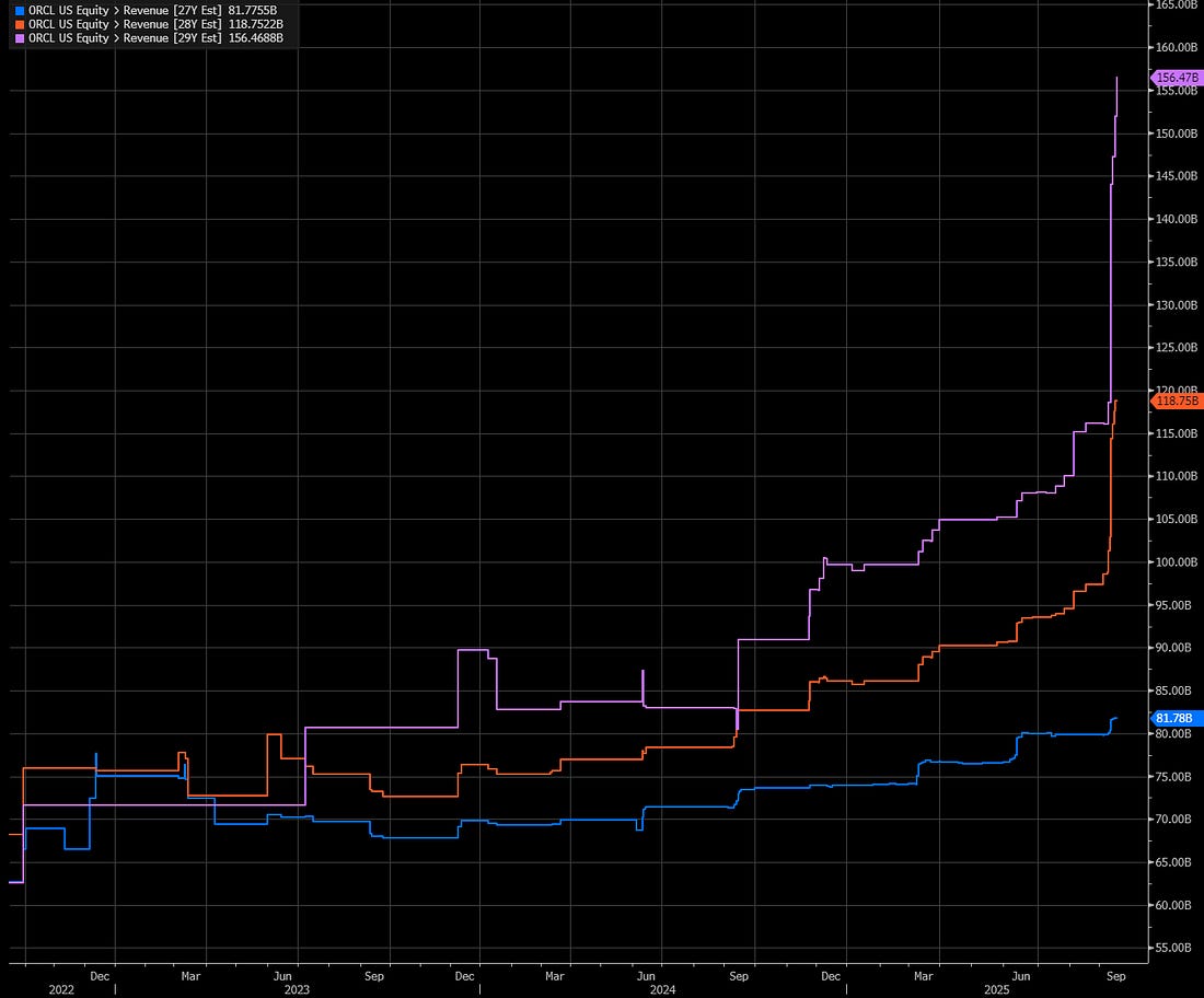 Oracle and Animal SpiritsOracle's result is the second most impactful earnings result this cycle. And I think it's a critical turning point.Oracle just posted the single most astonishing quarter I have seen since Nvidia’s blowout in May 2023. A reminder is that it was the quarter where Nvidia guided to 100% Y/Y growth and shocked markets after the ChatGPT moment. It has been almost a straight line to becoming the world’s most valuable company since then. Oracle’s guidance is staggering for a different reason: its sheer magnitude. This was the largest one-day move in any stock’s history by absolute value. Larry Ellison also became the wealthiest person alive in the span of a trading day. The opening line of Oracle’s guidance explains why: