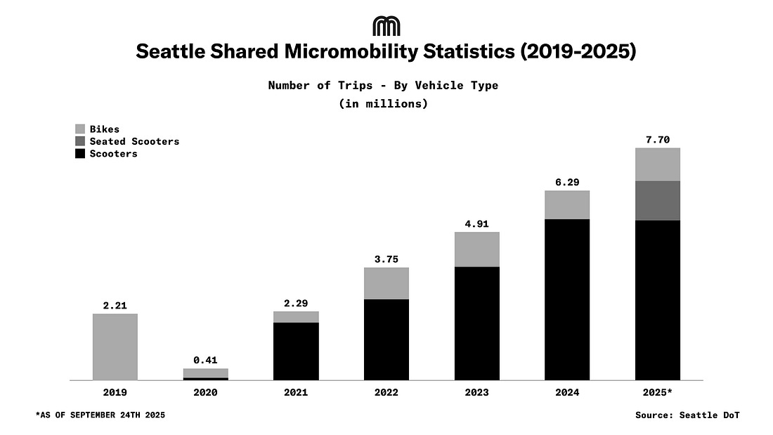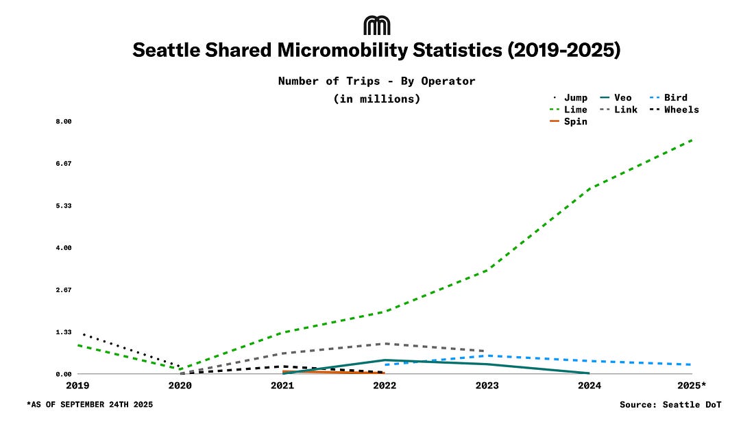 Seattle’s Journey to 7 Million Shared Micromobility Trips[Micromobility Pro] Seattle's success story in e-scooter and dockless bikeshare program, from peak competition in 2022 to Lime's dominance in recent times and exclusive insights from Seattle DoT.Welcome to Micromobility Pro, a bi-weekly publication which is part of The Micromobility Newsletter, where we deep-dive into the financials of micromobility companies and share exclusive insights tailored for professionals and members. Micromobility America 2026January 14 - 15, 2026 | Palace of Fine Arts | San Francisco 🎟 Prices are going up soon! Get your Early Bird Tickets now! January 14 - 15, 2026 | Palace of Fine Arts | San Francisco 🎟 Prices are going up in the next days! Get your Early Bird Tickets now! Get Involved with the World’s Premier Micromobility EventShowcase your brand to top industry decision-makers and gain year-round visibility. ✔️ Want to Sponsor or Exhibit? Snag the last Early Bird exhibitor spots - Click Here! 🎤 Want to Speak at the event? Apply now to take the stage - Submit Your Application 🚀 Are You a Startup? If you’re under 2 years old with <$1M in funding, apply to join our Startup Arena -Apply Here 🎟️ Want a Free Ticket? City officials, students, researchers, journalists & academics - Apply Here Webinar Alert! McKinsey’s Update on Mobility Shifts!🛴Join us for the McKinsey Webinar where experts Kathrin Kiefer and Darius Scurtu will discuss the latest mobility shifts and emerging trends. The session will also introduce the potential of Consumer GenAI and its impact on the mobility landscape. Don’t miss the Conversation - Register Now Contents
