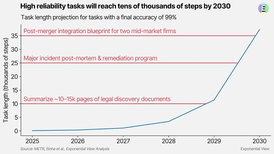 I had a fun conversation with China expert Dan Wang, whose latest book Breakneck is doing the rounds for all the right reasons. Our research notes on this China conversation are available exclusively to members of Exponential View. AI shows up at workThis week, we shared our estimates for the 99% step-length – the number of actions an AI system can take at near-perfect reliability before a human must intervene. Today’s frontier systems reliably manage around 100 steps at that threshold. By our estimates, the number could exceed 10,000 by 2029. A couple of years later, they might have between 3x and 10x that range. At that scale, an AI system could operate for weeks, potentially months, without supervision. Anthropic’s Claude 4.5 Sonnet, the best-in-class coding model, can reportedly work autonomously for 30 hours on a codebase, a significant jump from the seven-hour ceiling just months ago... Continue reading this post for free in the Substack app |
