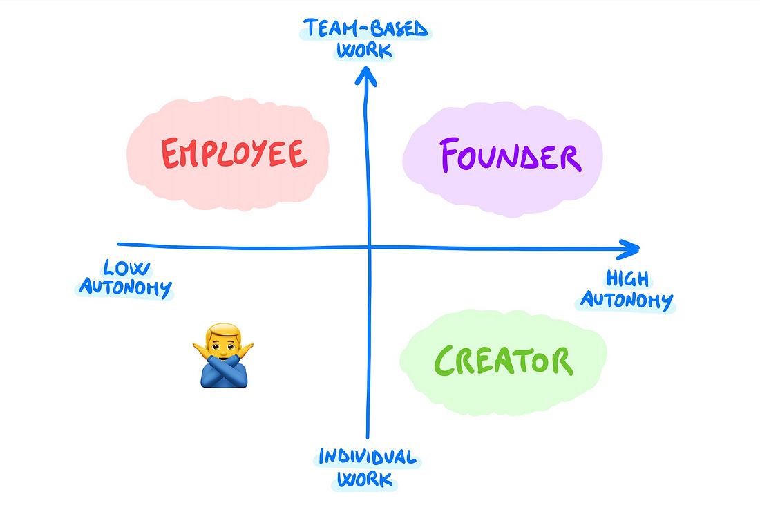 Founders, Employees, and Creators 🎭Thoughts and learnings about the various professional experiences I have had so far.Hey everyone — this is a more personal piece than usual, where I reflect on the various professional experiences I have had so far, and the main differences between them. I published some of these on Refactoring in the past and now I am writing an updated version because, in recent times, it seems I have got more friends than usual getting into sabbaticals, radical career changes, and similar. It might be AI, it might be the market, I don’t know. But I recognize some of that struggle from times in my life where I made hard calls, which sometimes worked, sometimes not. Even more so, at various points in my life people were puzzled about what I did for a living. There are plenty of myths and misconceptions about the work of founders, creators, and even regular employees. I have friends in all categories, and I have found that when people build a strong identity around some role, they tend to become defensive and skeptic of the other ones. So this piece should dispel some of such myths, while also shedding light on parts that I believe we don’t talk about enough. Let’s go! 🙋♂️ About meMy career so far has been made up of three main experiences: