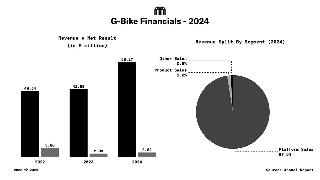 About G-BikeGbike is a South Korean micromobility company established in August 2017. It operates GCOO, a shared mobility platform offering bicycles and e-scooters, complemented by software development and sales. Headquartered in Seoul’s Gangnam-gu district, the company has pursued an international growth strategy with subsidiaries in the United States (GBIKE USA Inc.), Thailand (Thai Personal Mobility), and Vietnam (Viet Personal Mobility Co., Ltd.). In late 2024, Gbike expanded into Ghana, marking its first African operation. The company is controlled by CEO Yoon Jong-soo, who holds a 31.6% stake. 2024 Financial PerformanceGbike reported $58.3 million in revenue for 2024, a 40% increase from $41.7 million in 2023. Operating profit more than doubled to $6.96 million, while net profit rose to $2.82 million. Part of the improvement came from a change in accounting policy. The company extended the useful life of its bicycles and batteries from four years to five, reducing annual depreciation by $1.6 million and boosting net income... Continue reading this post for free in the Substack app |
