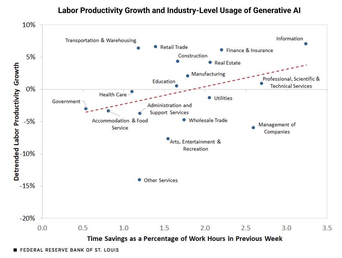 Hi, Welcome to our Sunday edition, where we explore the latest developments, ideas, and questions shaping the exponential economy. Enjoy the weekend reading! AI, jobs and productivityThe St. Louis FED estimates that generative AI may have increased labor productivity by up to 1.3% – and has had positive effects on industry-level productivity. While that may sound modest, a sustained 1.3% annual productivity boost would be transformative¹. We’re seeing the micro‑signals of this shift inside firms. A new paper found that AI agents increased code output by 39% without any decline in short-term quality. More telling: for every standard deviation increase in experience, developers accept 6% more agent‑generated code. Senior engineers are simply better at delegation, and delegation is a skill that compounds with time. As AI takes on more execution, the premium – particularly for those entering the workforce – will move from raw output to orchestration. I dug into this question with Ben Zweig of Revelio Labs, which builds its own data-driven view of the labor market. Ben and I share the view that it’s probably too early to really see AI impact in the early hiring. Ben’s perspective is that softening in early hiring is coming from somewhere else: