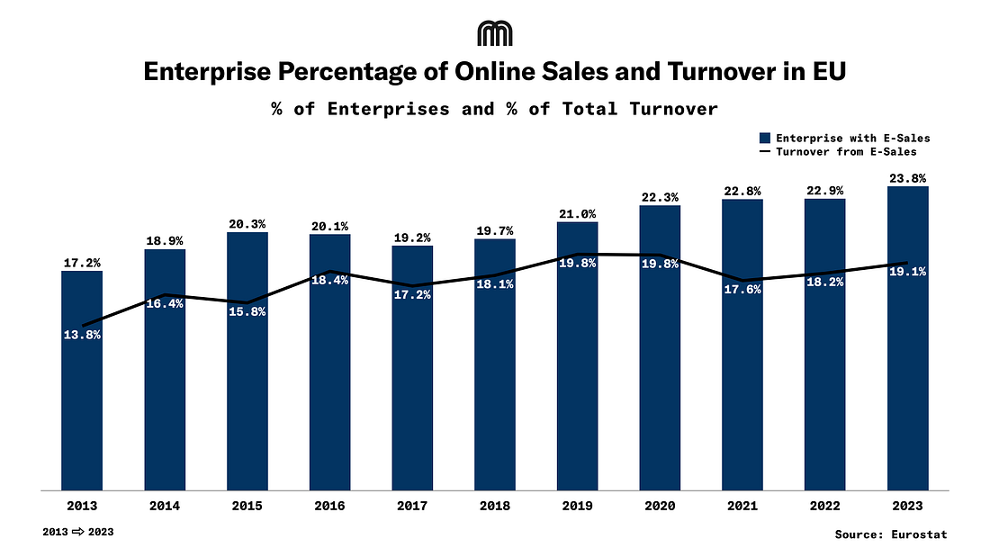 IntroductionMicromobility’s rise in delivery is driven by both necessity and opportunity. Congestion in major cities has made traditional delivery routes slower and more expensive, while emissions regulations and low-traffic zones are pushing companies to rethink how they operate. The last mile represents more than half of the overall cost of logistics operations, a problem that has only intensified as e-commerce exploded in 2020. Bikes, e-bikes, scooters, cargo trikes, and small autonomous delivery bots are proving far better suited to short-distance, high-frequency delivery tasks. In cities like London, New York, Seoul, and San Francisco, logistics operators, retailers, and gig-delivery platforms are increasingly integrating these lighter vehicles into their fleets. For instance, in London, with low average traffic speeds and congested streets, cargo bikes moved 6% faster than cars by bypassing traffic and eliminating parking-related problems. Online Orders & E-Commerce DemandE-commerce represents 14% of total retail in the US, with 77% of the population spending online. This $1.1T market is key for international merchants. In the EU, between 2013 and 2023, the share of enterprises that had e-sales increased from 17.21% to 23.83%. The turnover generated from e-sales increased from 13.81% to 19.12%. However, turnover in 2023 was 0.71 percentage points lower than the highest share recorded in 2019. The Indian e-retail market, valued at approximately $60B in Gross Merchandise Value (GMV) in 2024, has established itself as the world’s second-largest online shopper base. Quick commerce, projected to grow more than 40% annually through 2030, and hyper-value commerce, which has scaled to more than 12% of e-retail GMV, are gaining traction in smaller cities. Funds RaisedZoomoSubscribe to The Micromobility Newsletter to unlock the rest.Become a paying subscriber of The Micromobility Newsletter to get access to this post and other subscriber-only content. A subscription gets you: