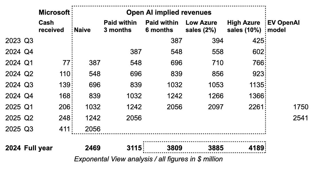OpenAI’s revenues have been leaked at roughly $3.7 billion for 2024. In most scenarios, adjust for settlement lags, and full year revenues within reasonable estimate range of that number. Of course, the naive model leaves an enormous gap, but it seems unrealistic to assume instant settlement. Our revenue model for OpenAI, lives somewhere between the lower end of these models... Subscribe to Exponential View to unlock the rest.Become a paying subscriber of Exponential View to get access to this post and other subscriber-only content. A subscription gets you: