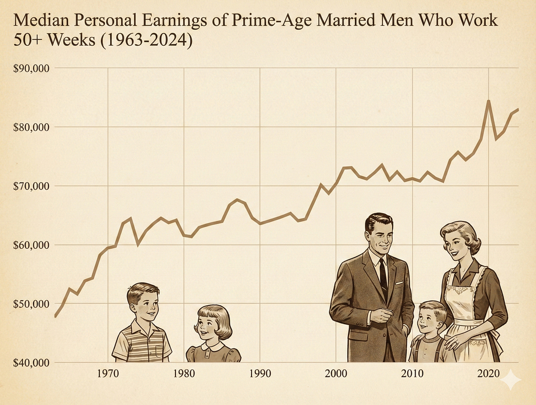 In 1963 spouse’s (and other family members’ incomes gave a 20% boost above the male level for median earnings. By 2024 those incomes gave an 85% boost. Thus—and i think this is Matt Bruenig’s main point—in 1963 median prime-age full-time male earnings bought you a participation ticket to an American Middle-Class TradLife, with a stay-at-home spouse and roughly median family income. Now it does not buy you such a participation ticket. If you are a right-wing male you thus see yourself as being forced to accept one of two forms of status dérogeance: