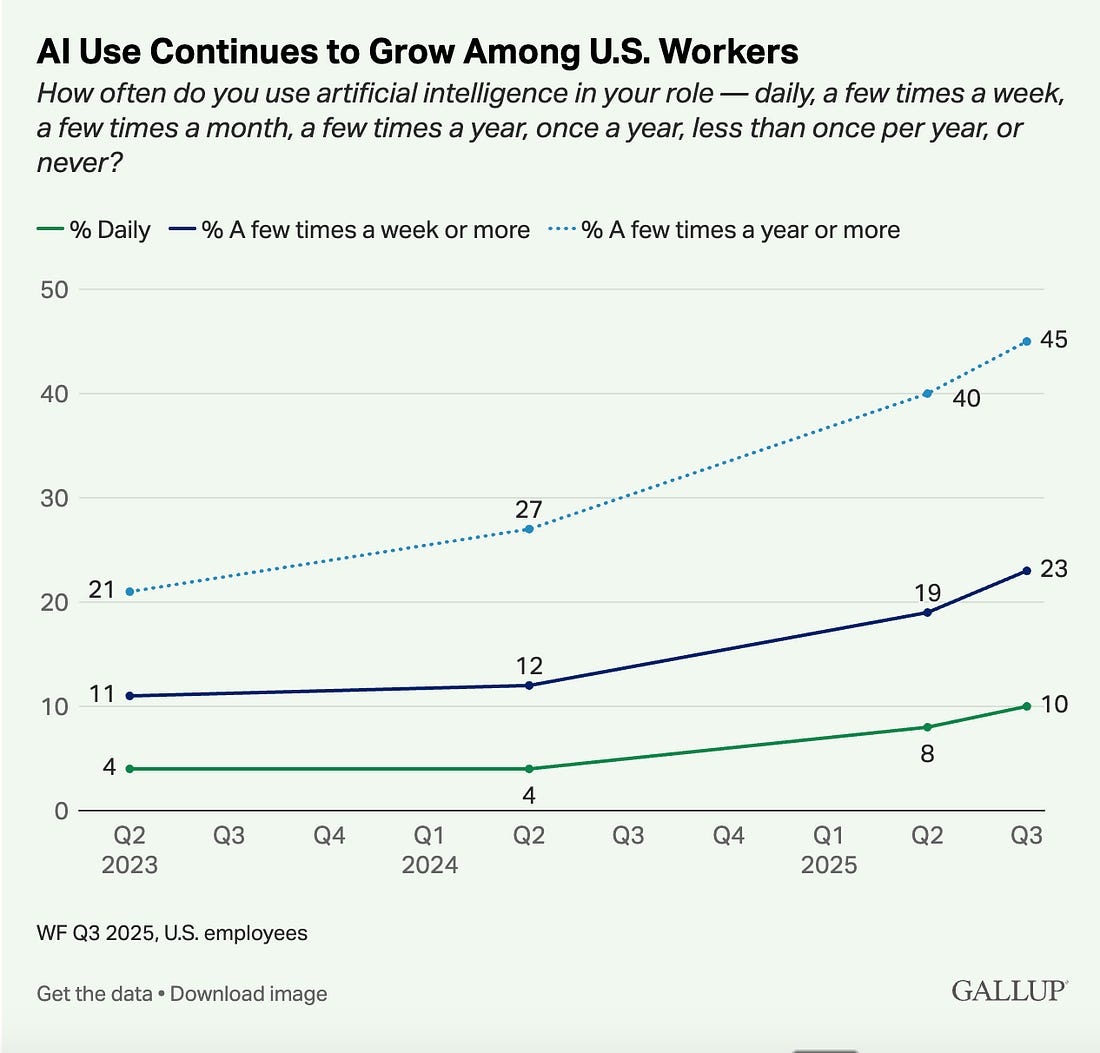 AI at work ↑ Adoption grew from 40% to 45% between Q2 and Q3 this year. But the real growth is in light, frequent use throughout the week. Enterprise sales ↑ OpenAI reported 8x year-on-year growth in its ChatGPT enterprise use, led by technology, manufacturing and healthcare. Age of construction ↓ Construction productivity has been flat or falling across most rich countries since the 1990s, despite decades of automation and evolving manufacturing practices. The cost of letting chips go ↑ Without any exports or smuggling, the US is projected to hold a 21x-49x lead in AI compute over China in 2026. Allowing unrestricted Hopper exports shrinks that lead to as little as ~1.2x-6.7x. (See EV#554)...
