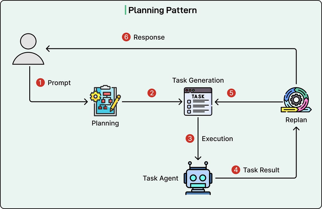 ReAct finds a middle ground, providing enough structure through reasoning while maintaining flexibility through iterative action. Planning PatternThe planning pattern takes a different approach from ReAct by emphasizing upfront strategic thinking before execution begins. When using the planning pattern, the agent starts by analyzing the overall goal and understanding what success looks like. It then breaks down this goal into smaller, more manageable subtasks. This decomposition continues until the agent has identified concrete, actionable steps. Crucially, the agent identifies dependencies between tasks, determining which steps must be completed before others can begin and which steps can potentially happen in parallel. The agent also considers what resources, tools, or information each step will require. Only after creating this structured plan does the agent begin execution. See the diagram below: One of the planning pattern’s key strengths is adaptive planning. The planning pattern works best for tasks with natural phases or stages where some activities logically precede others. It’s valuable for tasks with constraints like deadlines, budgets, or resource limitations where coordination matters. It shines in situations where mistakes or backtracking would be costly, making it worth investing time in thoughtful planning. Complex projects involving multiple work streams benefit greatly from planning. However, the planning pattern has limitations.