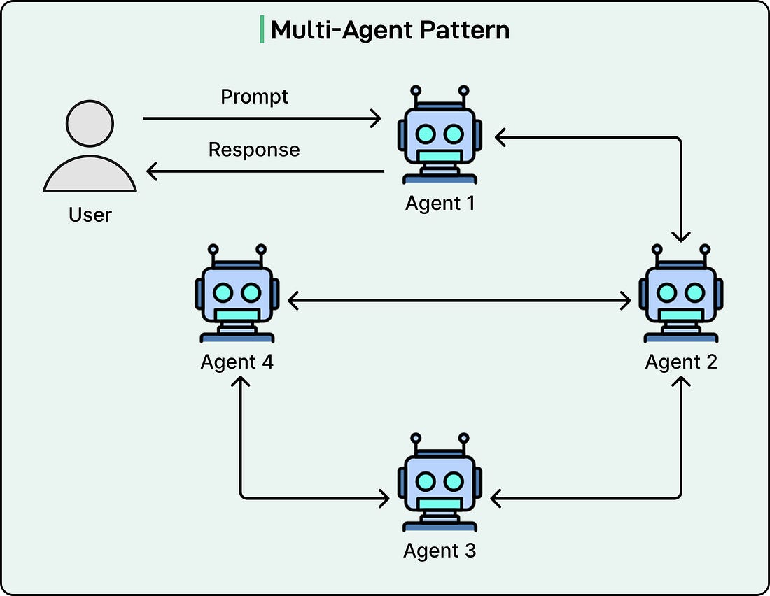 Multi-Agent PatternThe multi-agent pattern represents perhaps the most sophisticated approach to building AI systems. Instead of relying on a single agent to handle everything, this pattern uses multiple specialized agents that collaborate to accomplish tasks. Each agent has specific expertise, capabilities, or perspectives, and they work together much like human teams do. The core insight behind multi-agent systems is that specialization often leads to better performance than generalization. A single agent trying to be excellent at everything faces challenges. It must balance competing requirements in its design and training. It needs broad knowledge but also deep expertise. It must be creative but also critical. By dividing responsibilities among multiple agents, each can be optimized for its specific role. In a multi-agent system, we typically see several types of roles.