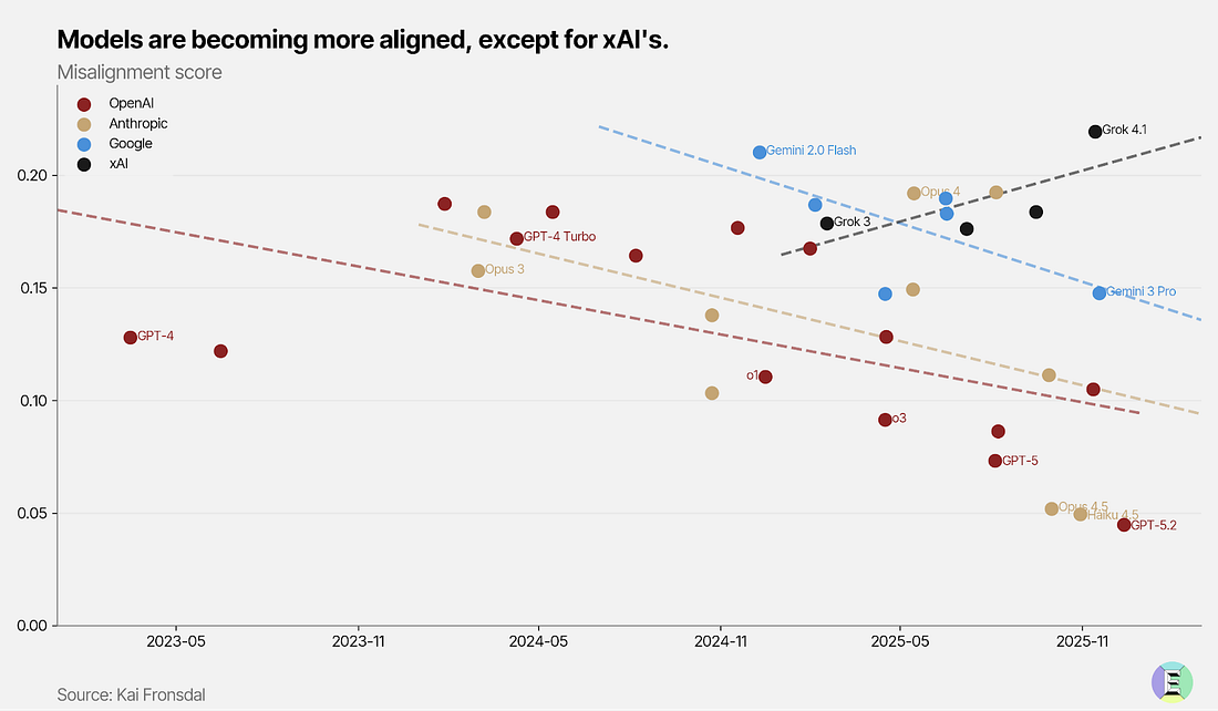 Ethics is economicsThe conventional story treats alignment as a tax on capability. Labs face a prisoner’s dilemma: race fast or slow down for safety while someone else beats you to market. At Davos, Dario Amodei said if it were only Demis and him, they could agree to move slowly. But there are other players. Demis told me the same after dinner. This framing might suggest to some that we’re in a race toward misaligned superintelligence. But I’ve noticed something in recent dynamics that makes me more hopeful. A coordination mechanism exists and paradoxically, it runs through the market. When users deploy an agent with file system access and code execution, they cede control. An agent with full permissions can corrupt your computer and exfiltrate secrets. But to use agents to their full potential, you have to grant such permissions. You have to let them rip⁴. Dean W. Ball, a Senior Fellow at the Foundation for American Innovation, noticed that the only lab that lets AI agents take over your entire computer is the “safety-focused” lab, Anthropic. OpenAI’s Codex and Gemini CLI seek permission more often. Why would the safety-focused lab allow models to do the most dangerous thing they’re currently capable of? Because their investment in alignment produced a model that can be trusted with autonomy⁵. Meanwhile, the one company whose models have become more misaligned over time, xAI, has encountered deepfake scandals, regulatory attention, and enterprise users unwilling to deploy for consequential work. Alignment generates trust, trust enables autonomy, and autonomy unlocks market value. The most aligned model becomes the most productive model because of the safety investment. See also: