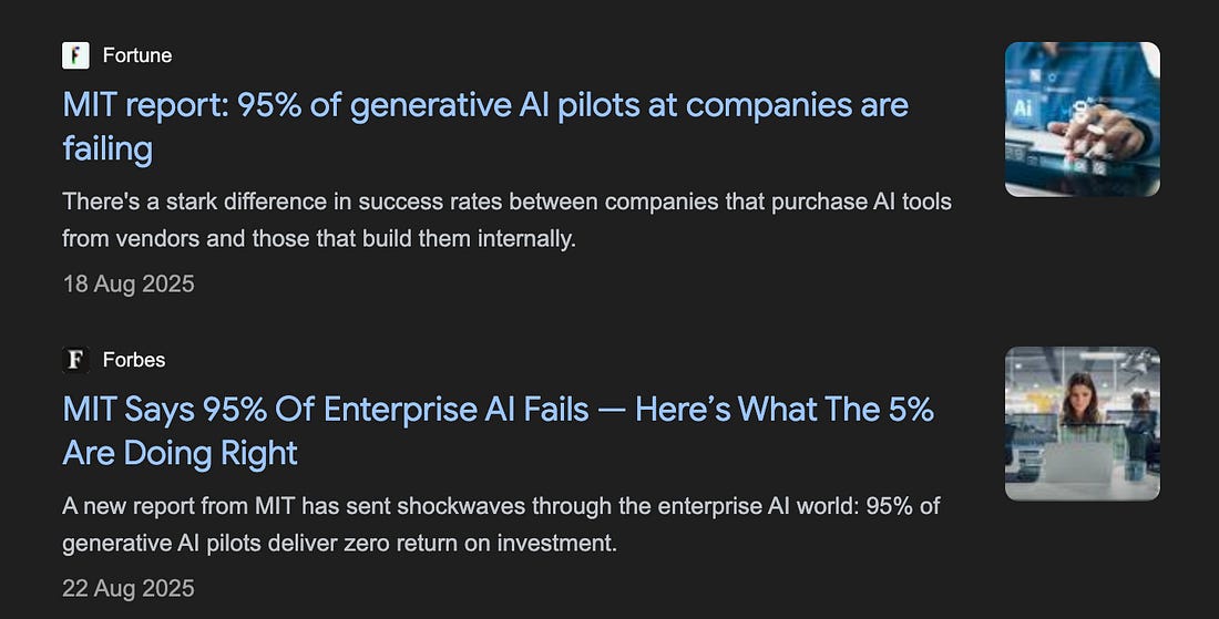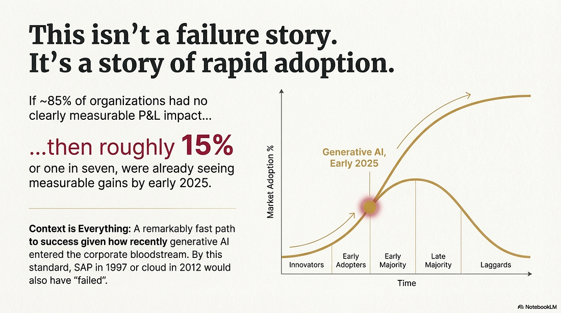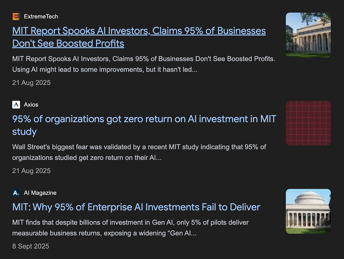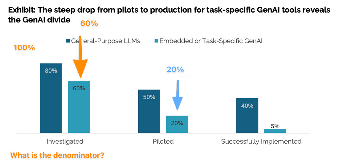 I did not receive a response to my enquiries. So I had to escalate to MIT Media Lab’s leadership. Raskar and Chari are attached to The Media Lab, which operates as a research laboratory within MIT’s School of Architecture and Planning. The School of Architecture and Planning rolls up to the top level of the institute. What MIT told meFaculty Director of the MIT Media Lab, Tod Machover, did reply. MIT’s counsel, Jason Baletsa, was copied³. In that correspondence, Professor Machover described the document as “a preliminary, non-peer-reviewed piece” created by individual researchers involved in Project NANDA. Machover told me that the NANDA research group now operates within an independent non-profit foundation. (Although the MIT Media Lab still maintains a NANDA research page.) The report, I was told, was posted briefly to invite feedback. Indeed, it was posted on MIT’s website from 18 August to 16 September, according to the Internet Archive. That framing – early, exploratory, posted for comment – is plausible. Academia must be allowed to think in public. Drafts and half-formed ideas are a reasonable part of the process of scholarship. During the feedback period, one of the four authors of the report was quoted in the media. Much of the subsequent media coverage presented it as a finding, not as an early draft posted for comment. But this is a problem, as much for MIT as it is for us. Treating casual, informal work as equivalent to scholarship doesn’t just mislead the market; it erodes the trust scaffolding that industry participants, investors, founders, and the public rely on to make decisions. The report no longer appears on an MIT.edu domain. However, the PDF circulating online still carries MIT branding and is hosted on a third-party research aggregator. There is no canonical MIT-hosted version, no note explaining how it should be cited, and no institutional clarification that would stop the statistic from being treated as an MIT finding. When I pushed further on the question of whether it is correct or incorrect to call this “a piece of research from MIT / MIT Media Lab” I didn’t initially get a clear answer. Eventually, in an email dated 12 December 2025, Kimberly Allen, MIT’s Executive Director of Media Relations, wrote on behalf of the Provost and VP for Research⁴: “There were MIT investigators involved. It was unpublished, non-peer-reviewed work. It has not been submitted for peer review as far as we know.” That’s somewhat helpful. The number had been acting as an institutional fact. “MIT says” has, with very good reason, a great deal of weight. The authors themselves say: “The views expressed in this report are solely those of the authors and reviewers and do not reflect the positions of any affiliated employers.” But the paper still carries an MIT logo so people stumbling across it might read more into it than it may deserve. That brand continues to do the work for something that appears incomplete. It is incredibly hard to get a role at a top university. “Insanely hard” is what one academic friend told me, precisely because the high standards of those organisations have produced a very costly external signal about quality. Breaking the numberSo what’s a more reliable reading? If you triangulate across what firms are actually reporting, and account for adoption lags and sampling bias, can we narrow the plausible space for ‘no enterprise-level, clearly measurable P&L impact yet’? The strongest part of the rewrite lives with the denominator. The 5% number emerges, with huge confidence intervals, from the research if the denominator includes every organization that didn’t even try to implement a task-specific AI. This is like stating that I failed to board the American Airlines flight from JFK to Heathrow last Thursday. True, but I wasn’t booked on the flight. I wasn’t even in New York that day. And if you consider a more reasonable denominator: those who tried to implement such an AI through a pilot, you end up with a success rate of 5 out of 20, or 25%. The error margins? Possibly in the range of +/- 15%; so a 10 to 40% success rate based on running this through a handful of reasoning LLMs at the highest thinking mode. If you make more aggressive assumptions about sampling flaws and shaky definitions, the dispersion widens further. If the underlying data was shared by the researchers, we could do a much better job of this. But it isn’t clear why anyone should make any type of decision based on this. A defensible inference band sits in the low-80s, not the mid-90s of organizations that started pilots on task-specific AI, not seeing results at some point between January and June 2025. But it is plausible that number could be much lower. It certainly isn’t the nihilistic “95 percent” that markets have begun to quote as if it were an MIT-certified measurement. By this standard, SAP in 1997 or cloud in 2012 would also have failed. Put plainly, if around 85% of organizations had no clearly measurable P&L impact, then roughly one in seven were already seeing measurable gains by early 2025. A remarkably fast path to success given how recently generative AI entered the corporate bloodstream. And I’m being conservative, it could easily have been much higher, one in five or more.⁵ This is a far more nuanced picture than “95 percent failure” – a headline that invites either complacency (“AI is hype”) or fatalism (“it’s impossible”). Orphaned stats, and the fixGo one level deeper, and the real issue isn’t whether the number is 95, 86, 51, or 27 – it’s that the “95 percent” has become an orphaned statistic. We’re familiar with orphaned numbers. Like we only use 10% of our brains. That it takes seven years to digest swallowed gum. That Napoleon was short. The goldfish has a 3-second memory. That there are three states of matter. It’ll be cited… just because. But, unlike the goldfish that for