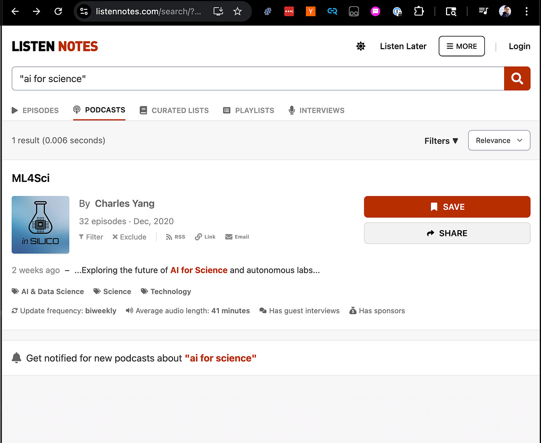Persuant to the last point, we think general consumer AI media, or even technical AI media, is woefully underequipped to do good science communication around “AI for Science for Engineers”. Today, we’re embarking on that journey with Latent Space’s new AI for Science podcast. We’re nervous about it too — but we think this mission is too important, and the gap between the obvious potential and the lack of supply, to wait any longer. We’d love your support and feedback as we start this new adventure. As a final word, thank you to RJ Honicky (Miraomics) and Brandon Anderson (Atomic) for stepping up to host the new pod. Alessio and I are devtools guys; we could not start AI for Science coverage without actual PhD’s and Science founders! 1 Proof: there’s an “ML4Sci” podcast and an “ai4.science” event series, a domain we wanted to buy, but no podcast that proudly self identifies as simply “the AI for Science podcast”.