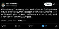 | | | | Rich Holmes, Andy Masley, and Aakash Gupta posted new notes | |  | | | | Claude’s new Cowork product is a fine example of Anthropic doing what good product teams do. They shipped a product (Claude Code), realised that non-engineers found value in it and used that data to inform an entirely experimental new sub-product… | | Read More %26strokeWidth%3D2) |