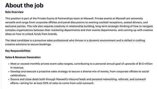 I think that’s likely to get a response. And if it’s not, I’d consider emailing this sort of thing to other investors of Bryant’s previous companies or other people who engaged in the post. If none of that goes well, you could of course just email Bryant directly. He may not respond - because not everyone is going to respond - but it’s worth a shot. You could repeat this sort of strategy with several other companies, and I’d bet that within 5-10 of them you’d find someone interested in hiring you. By the way, want to join our Slack? Join Friends of Next Play here. Scenario 3: You see that David Litwak from Maxwell Social is building a social club and creative studio in NYC, and that he’s looking for salespeople.What are some ideas that could help you get hired?I would start by reading about David and Maxwell Social. I would read all the articles I could find online. I would look at everyone who works at the company, and see what they are posting about, and what types of events they are running today. The LinkedIn post did not actually contain a job description, but I would find it by Googling around. So it looks like a big part of being a good salesperson at the company is being able to generate revenue, ideally using a proactive strategy to help find people/companies who want to book events. How could you prove your ability to do that well? I would cold email 10 VC funds in NYC and ask them how they do community today. Do they do in person events? I would propose hosting a roundtable event at Maxwell Social, and also tell them you’ll help facilitate the crowd of e.g. future founders. I would then email the CEO of Maxwell and tell him you’re about to close your first deal and you’d like to find a way to work with them on the sales team. I think that would be a hard email to not respond to. I would also think about more creative types of events that you could host at Maxwell. For example, I would look at Youtubers and TikTokers in NYC and see if they’d like to host small events with their subscribers. I would see if any musicians wanted to host a music video in the space. I would look at up and coming fashion brands in NYC out of fashion school and see if they would like to do a small mini fashion show in the space. I would look up events happening in NYC on Luma or Partiful, and see which brands are running public events. I would get in touch with those brands and see if they were interested in using the space. Now it’s your turn. I want you to try this technique out on two startups you are interested in working at. Not sure where to look? Here are some suggestions: Let me know how it goes. Email: hi@nextplay.so.