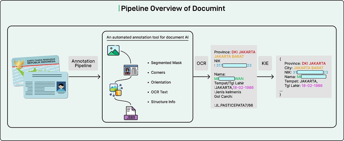 Initial benchmarking of Qwen2VL and miniCPM on Grab’s dataset revealed low accuracy, primarily due to the limited coverage of Southeast Asian languages. This finding motivated the team to pursue fine-tuning to improve OCR and KIE accuracy. However, training LLMs is both data-intensive and GPU resource-intensive, which brings up two important questions: how to use open-source and internal data effectively, and how to customize the model to reduce latency while maintaining high accuracy. Training Dataset GenerationGrab developed two approaches to generate training data for the model: 1 - Synthetic OCR DatasetThe first approach involved creating synthetic training data. Grab extracted Southeast Asian language text content from Common Crawl, a large online text corpus that contains data from across the internet. Using an in-house synthetic data pipeline, the team generated text images by rendering this content in various fonts, backgrounds, and augmentations. The resulting dataset included text in Bahasa Indonesia, Thai, Vietnamese, and English. Each image contained a paragraph of random sentences extracted from the corpus. This synthetic approach offered several advantages. It allowed controlled generation of training examples, enabled the creation of unlimited variations, and ensured coverage of different visual styles and document conditions. 2 - Documint: The Auto-Labelling FrameworkThe second approach leveraged real documents collected by Grab. Experiments showed that applying document detection and orientation correction significantly improved OCR and information extraction. To generate a preprocessing dataset, Grab built Documint, an internal platform that creates an auto-labelling and preprocessing framework for document understanding. Documint prepares high-quality, labelled datasets through various submodules that execute the full OCR and KIE task. The team used this pipeline with a large volume of Grab-collected cards and documents to extract training labels. Human reviewers then refined the data to achieve high label accuracy. Documint consists of four main modules:
