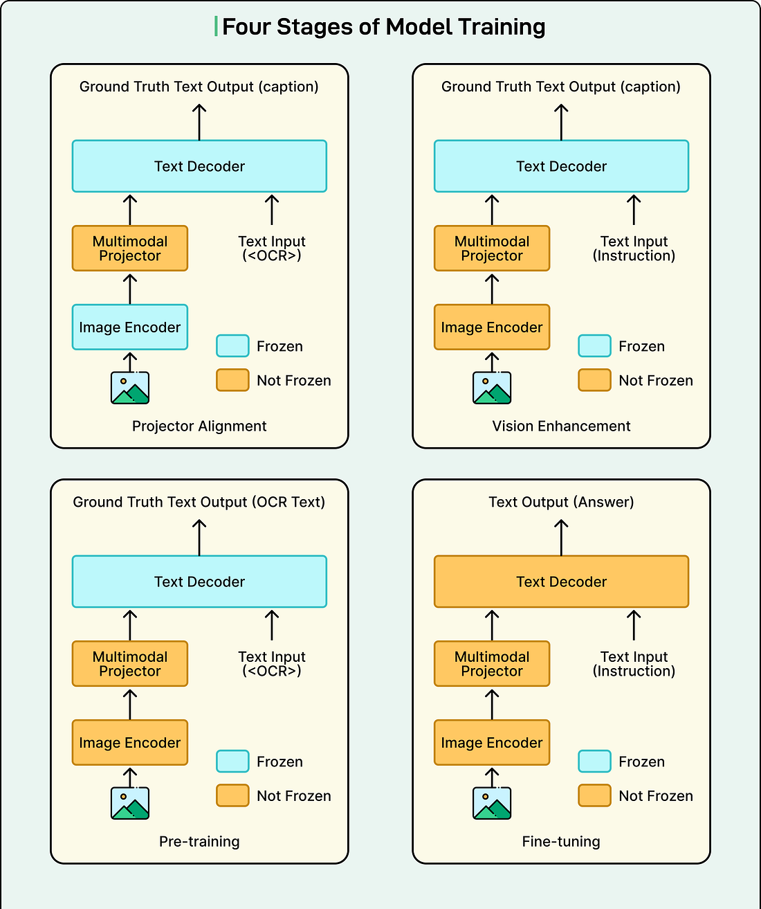 The results were significant. For example, the Thai document accuracy increased by 70 percentage points from the baseline. Vietnamese document accuracy rose by 40 percentage points from the baseline. Indonesian documents saw a 15 percentage point improvement, and Philippine documents improved by 6 percentage points. The fully fine-tuned Qwen2-VL 2B model delivered substantial improvements, especially on documents that the LoRA model had struggled with. Phase 3: Building a 1B Model from ScratchWhile the 2B model succeeded, full fine-tuning pushed the limits of available GPUs. To optimize resource usage and create a model perfectly tailored to their needs, Grab decided to build a lightweight Vision LLM with approximately 1 billion parameters from scratch. The strategy involved combining the best components from different models. Grab took the powerful vision encoder from the larger Qwen2-VL 2B model, which had proven effective at understanding document images. The team paired it with the compact and efficient language decoder from the Qwen2.5 0.5B model. They connected these components with an adjusted projector layer to ensure seamless communication between the vision encoder and language decoder. This combination created a custom Vision LLM with approximately 1 billion parameters, optimized for both training and deployment. Four-Stage Training ProcessGrab trained this new model using a comprehensive four-stage process: