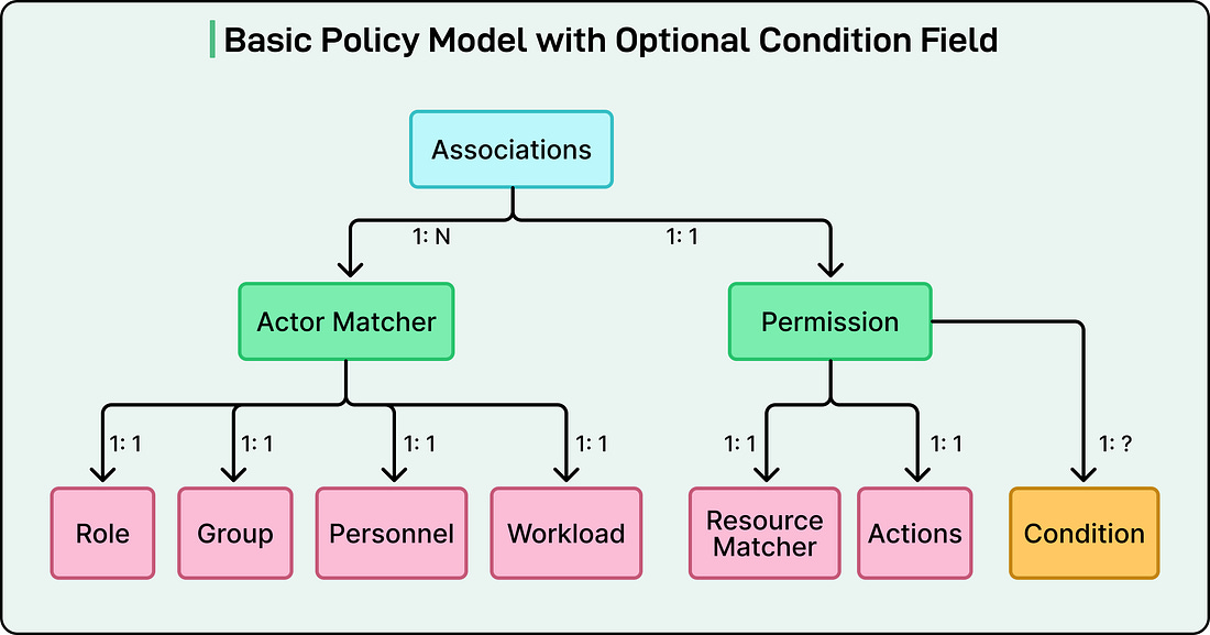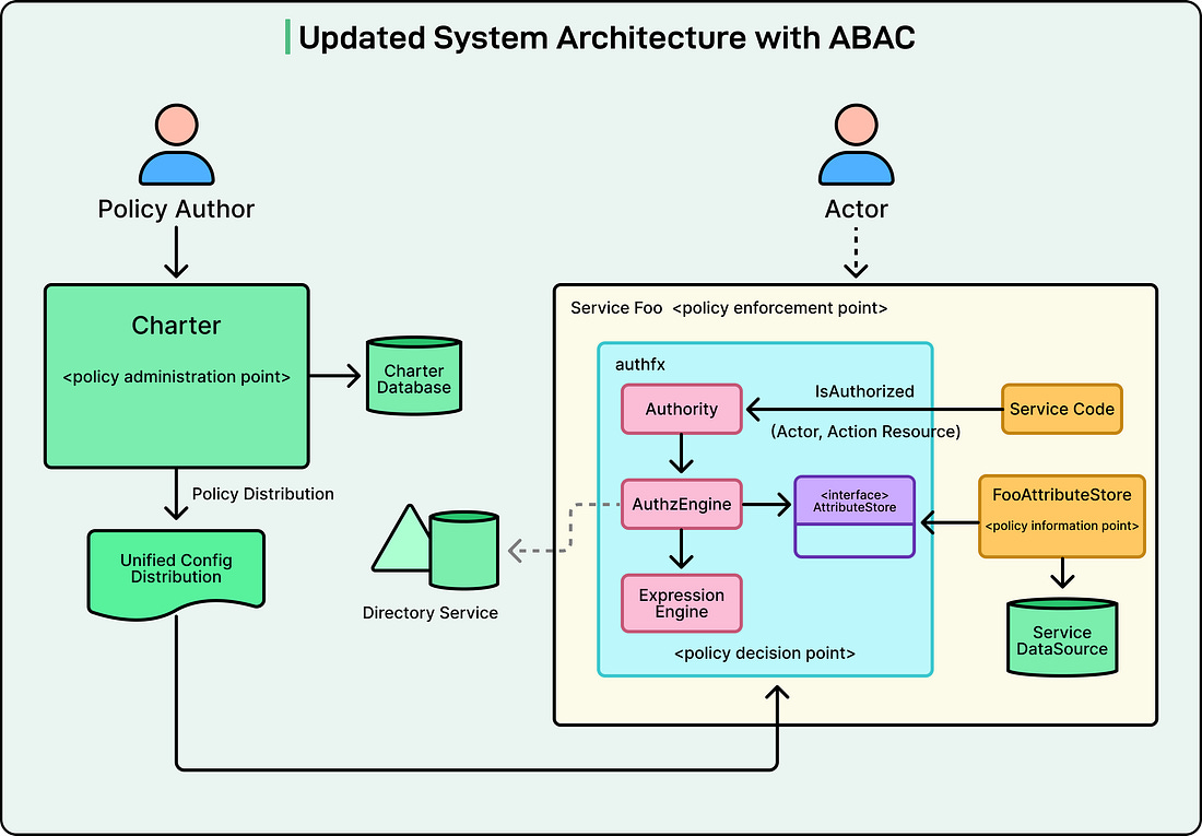 Attribute Stores are the sources that provide attribute values at authorization time. In formal authorization terminology, these are called Policy Information Points or PIPs. When evaluating a condition, the authorization engine queries the appropriate attribute store to fetch the necessary values. The enhanced policy model adds an optional condition field to each permission. Here’s an example: This policy allows employees to perform CRUD operations on payment records, but only when two conditions are met: the payment type is a credit card, and the employee’s location matches the payment’s location. The Technical Architecture of ABACWhen ABAC is enabled, the authorization architecture includes additional components. The authfx library now includes an authorization engine that coordinates policy evaluation. When a request arrives, the engine first checks if the basic requirements are met: does the actor match, does the action match, does the resource match? If those checks pass and a condition exists, the engine moves to condition evaluation. The authorization engine interacts with an expression engine that evaluates the condition expression. The expression engine identifies which attributes are needed and requests them from the appropriate attribute stores. See the diagram below: Uber defined four types of attribute store interfaces: