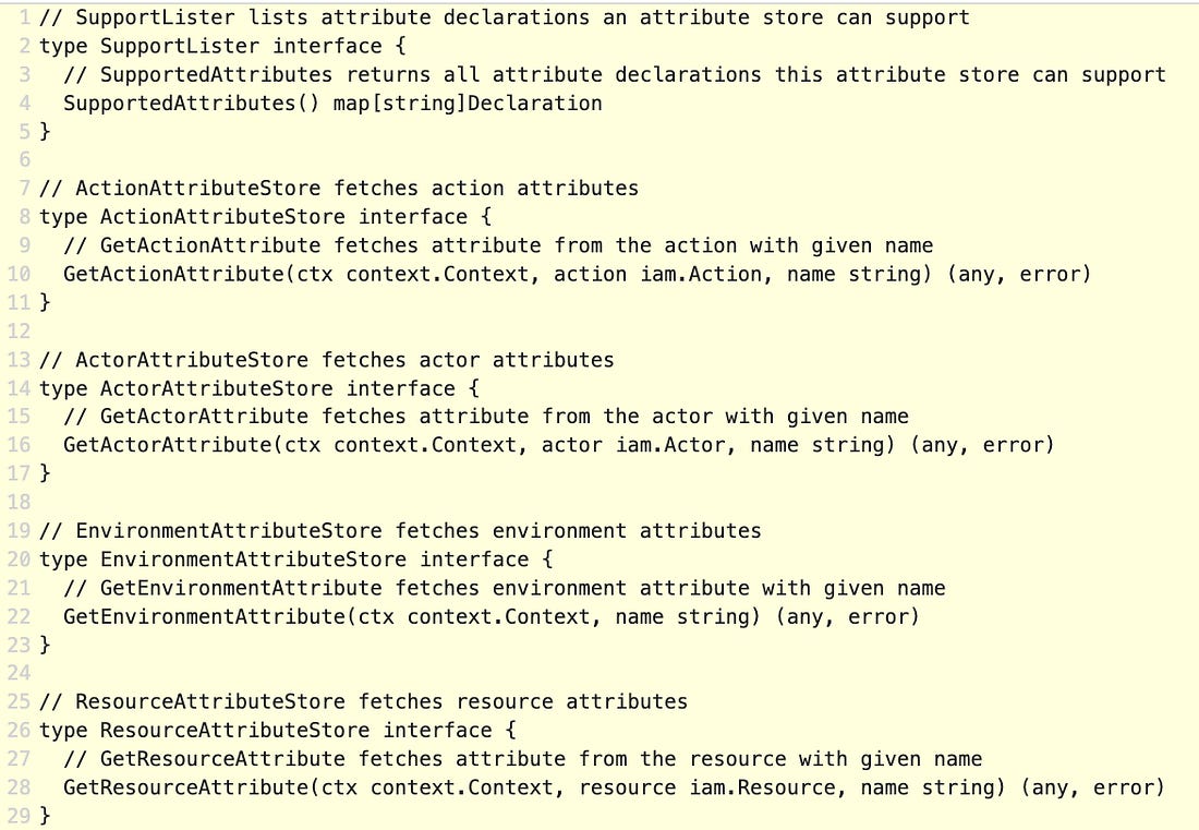 Each attribute store must implement a SupportedAttributes() function that declares which attributes it can provide. This enables the authorization engine to pre-compile condition expressions and validate that all required attributes are available. At runtime, when an attribute value is needed, the engine calls the appropriate method on the corresponding store. See the code snippet below:
