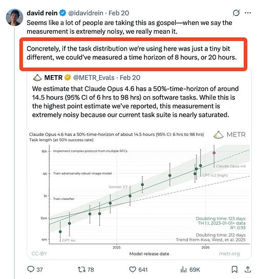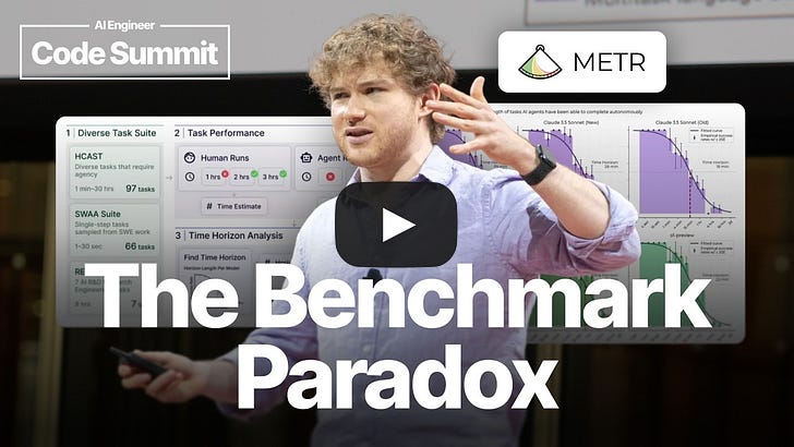 AIE Europe CFP and AIE World’s Fair paper submissions for CAIS peer review are due TODAY - do not delay! Last call ever. We’re excited to welcome METR for their first LS Pod, hopefully the first of many: METR are keepers of currently the single most infamous chart in AI: But every Latent Space reader should be sophisticated enough to know that the details matter and that hype and hyperbole go hand in hand in AI social media, because the millions of impressions that got, by people who don’t understand or care about the nuances, disclaimers, and error bars, far outreaches the 69k views on the corrections by the people who actually made the chart: There’s a lot of nuance both in making benchmarks (as we discovered with OpenAI on our SWE-Bench Verified podcast) and in extrapolating results from them, especially where exponentials and sigmoids are concerned. METR’s Long Horizons work itself has known biases that the authors have responsibly disclosed, but go far too underappreciated in the pursuit of doomer chart porn. If you’re interested in a short, sharable TED talk version of this pod, over at AIE CODE we were blessed to feature Joel twice, as a stage talk and with a longer form small workshop with Q&A: We also make sure cover some of METR’s lesser known work on Threat Evaluation but also Developer Productivity, where 2x friend of the pod and now Zyphra founder Quentin Anthony was the ONLY productive participant! Finally, if you’re the sort to read these show notes to the end, then you definitely deserve some pictures of Joel shredding the guitar at Love Band Karaoke which we mention at the end: Full Video PodTimestamps00:00 What METR Means Transcript...Listen to this episode with a 7-day free trialSubscribe to Latent.Space to listen to this post and get 7 days of free access to the full post archives. A subscription gets you: