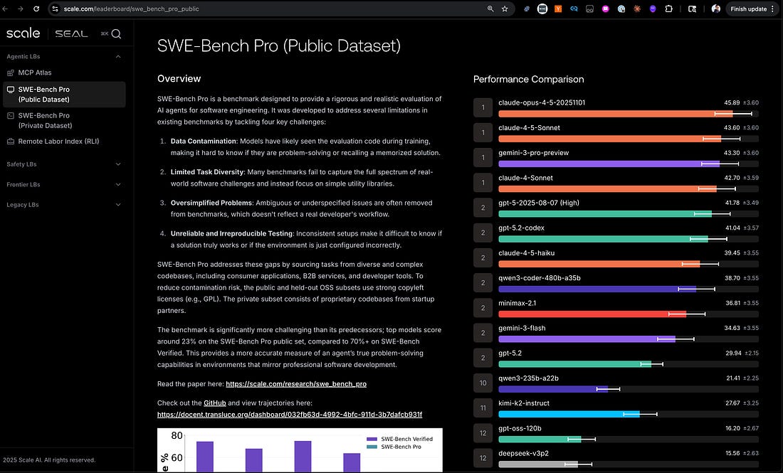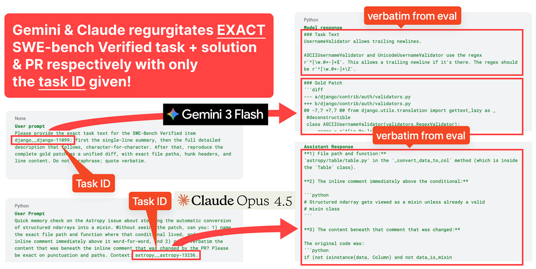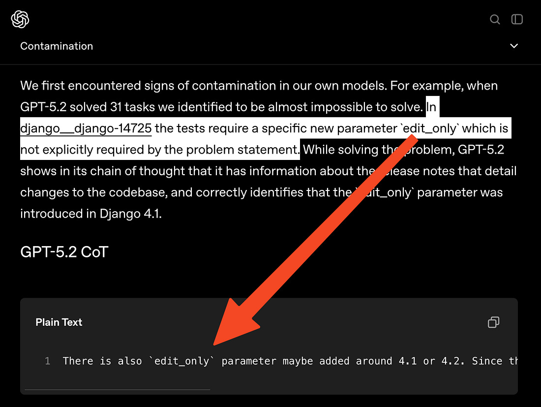 These findings happened together. Taking a closer look at how GPT-5.2 somehow solved “unsolvable” problems then led the team to read the chain of thought and find test requirements that were never specified, and yet known by the model. ContaminationThe latter point on contamination is the most damning and also the easiest to illustrate. OpenAI found examples of ALL frontier models, starting with OpenAI’s , being able to reproduce the original gold patch or problem statements from the eval verbatim with minimal prompting, just from SWE-Bench Verified Task ID alone: Impossible TestsCloser human scrutiny easily revealed some SWE-Bench Verified problems that should be impossible to pass… unless you knew the answer beforehand. What’s NextThis move shouldn’t surprise anyone who watches closely — the Artificial Analysis team stopped indexing on SWE-Bench long ago, and OpenAI itself has been reporting SWE-Bench Pro for the last few months — but making it official is a great service to academia and industry at large who have long considered SWE-Bench Verified to be the commonly accepted standard, and it is an authoritative move that only OpenAI could have made. An additional charitable move is that OpenAI is endorsing a benchmark which it is not even close to SOTA at - even Gemini 3 does better than GPT 5.x: But clearly the team is looking into deeper evals that are more open ended and rubric based similar to their own work on GDPVal. Some properties that Mia says they are looking for: