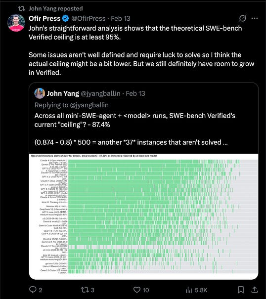 ⚡️SWE-Bench-Dead: The End of SWE-Bench Verified — Mia Glaese & Olivia Watkins, OpenAI Frontier Evals & Human DataIt's time to take the next step up in frontier agent evals.First speakers for AIE Europe and AIEi Miami have been announced. See you there! We’ve been somewhat making tongue in cheek references to the very very minor bumps on SWE-Bench Verified scores every time a new frontier model is released (Opus 4.5 → 4.6 was literally a 0.1% down step), but it is a whole other matter for the original authors of SWE-Bench Verified to make the call to discontinue reporting it. We were excited to have Mia Glaese, original coauthor of SWE-Bench Verified and VP of Research on the Frontier Evals, Human Data and Alignment teams, and Olivia Watkins, Researcher on Frontier Evals, drop by to talk about their decision to publicly abandon SWE-Bench Verified today and endorse SWE-Bench Pro: The discussion around the saturation of SWE-Bench has been swirling in the community for over a year now — most frontier model numbers consistently report around 80%, and the authors of the original SWE-Bench still assert that the “ceiling” for a saturation call should be closer to 87-95%, aka there are still quite a few more percentage points to go, even on the filtered subset of 500 tasks in Verified. But OpenAI have done a deeper analysis of 138 problematic problems (getting at least SIX more engineers to review all the issues) and found two further issues that have triggered the decision today: