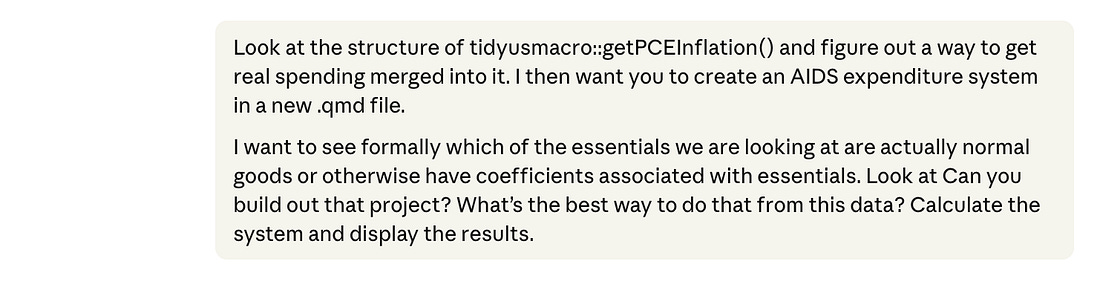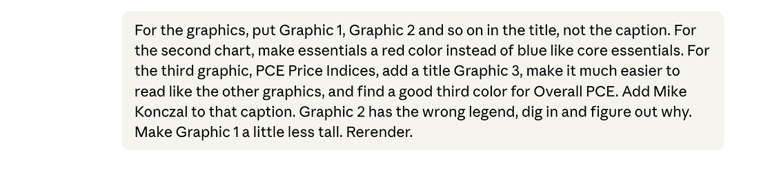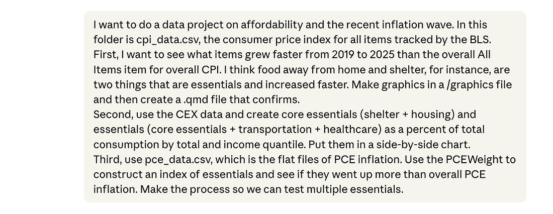 Three Ways Terminal AI Has Changed How I Work (And Whether It's Coming for My Job)How terminal AI compresses setup, robustness checks, and iteration without replacing judgment, and whether Olivia Rodrigo caused the inflation wave.There’s been a lot of buzz about terminal-based AI tools like Claude Code and OpenAI’s Codex. Unlike the browser chat interfaces most people use, these tools run locally on your computer and they’ve gained serious traction over the past several months. But much of the discussion has been caught between people building applications as fun personal hobbies on one end, and massive enterprise software on the other. Most of us who use these professionally will live somewhere in the middle. (The discourse is also wedged against whether AI will cause large-scale unemployment or otherwise destabilize society.) I’ve integrated these terminal tools into my workflow over the past two months. Below are three specific ways I’m using them that are genuinely new, and where I’m not going back to how I worked before. Terminal AI compresses the setup and robustness-checking phase of knowledge work. I’ll also explain what makes them different from the browser-based chat tools, and whether I, Mike Konczal, am about to be automated out of a job. My relevant background is in a footnote here.¹ This is not a setup guide, though I’ll try to explain ways these examples might be applicable to you. That will be helpful, as these tools are not going away. Use 1: Real-Time Analysis, Without the Prep WorkI maintain a set of R files, the statistical programming language, for instant analysis of the economic data releases. Those numbers generally come out at 8:30 a.m. several times a month, and by 8:35 a.m. I need to know the big takeaways. I’m not trading on this information, so I don’t need to know within milliseconds. But I do make statements that other political actors use, and accuracy is vital. For instance, I was interviewed by the New York Times shortly after the jobs numbers last week, and I want to be able to say something useful, interesting, and, most important, true. My old workflow was that I’d take one or two hours the day before the major monthly data releases and manually code a few new graphics based on what I expected would be important. Maybe I post them or maybe I don’t, but they help me keep track of how the economy is moving, and they force me to think of new pieces I may have been missing. Now I just ask Code/Codex to write them. It’s usually 95% of the way there on the first go. I check the math and get it fully there with one or two more exchanges. What used to be 4–5 hours of work in an average month is now 15 minutes. The reduction in time allows me to ask even more questions and prepare more materials. I have a lot of experience in this, so I’m able to proofread the code and I double-check that it is doing what I want it to do. Why not just use the Claude or ChatGPT webpage for this? I used to do this. But there is significant copy-and-paste overhead. The old way meant copying code out of the browser, pasting it, running it, copying any error messages or changes that needed to be made back into the chat, and repeating. With the terminal tool, the LLM writes the code and runs it in the same folder. It can see whether what it did worked, investigate failures on its own, and I see the result after every pass without touching a clipboard. Why not just let the AI find the interesting result? The LLM actually does a poor job of this, as it lacks the context for what people are searching for or what stands out. It can summarize news reporting on those numbers after they circulate, but influencing that coverage is the point of the exercise. So if your job involves monitoring something that changes on a schedule, such as earnings releases, polling averages, clinical trial updates, or monthly sales figures, and you currently spend the hours before and after each release manually refreshing Excel models or rerunning Tableau dashboards, this is the use case that will feel most immediately different. The tool doesn't just help you go faster. It makes it cheap to add new angles of analysis instead of being locked into what you could cover in limited prep time. Use 2: Building Out a ReportLast Monday, I published a blog post about the affordability crisis. Check it out! Near the beginning are three graphics I made on the price, spending, and indexing of essential items. To do this I created a folder on my desktop and dropped in the relevant data files. Then I gave this opening prompt: Note I ask it to create a qmd file (Quarto Markdown), which can render to html, pdf, or slides with minimal changes. You’ll probably be using a similar method in the future. It got very close on the first pass. I scanned the code to check the methodology, spot-checked one item from each by manually calculating it (knowing the algorithm means that if one is correct, all of them are). From there the prompts are mostly about cleaning up: I’m just talking into the microphone at this point, deciding which essentials to include (some categories overlap in ways the LLM wouldn’t know) while simultaneously tweaking colors, legends, titles, and sizing, while it re-renders the graphic. One thing I worry about is that if I’m not mucking around with the data myself, I’ll miss important side observations. But even in this pass I notice things: cigarettes show a huge price increase (it’s very funny that the LLM thought cigarettes are an essential), and I wonder if it’s driven by excise taxes, the same way tariffs are mechanically increasing the price of goods in 2025 and 2026. Something to investigate. A benefit here is that stress-testing became trivial. Want to check whether your finding holds under a different index, or a different date range? If you are using Excel this is a nightmare, and even with statistical programming it’s a slog. But I get this done in a minu