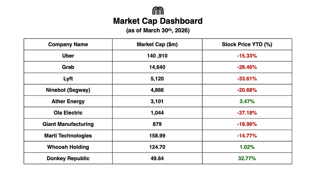 Heads up! Our podcast has a new dock on YouTube, Apple, and Spotify. Make sure to resubscribe so you don’t miss out. Stay Tuned!!! Market Cap DashboardDott Launches New Fleet in Bristol and BathDott is launching a new fleet of over 4k e-scooters and e-bikes across Bristol and Bath, marking another upgrade to the region’s shared mobility scheme. The rollout includes more than 3k e-scooters and 1k e-bikes, featuring improved comfort, safety, and performance. It also introduces a new blue branding, replacing earlier fleets from operators like Voi and Tier. Backed by a £5m investment, the expansion aims to improve accessibility, reduce improper parking, and extend services to more areas across the West of England. Just how popular are cargo bikes in Canada?Cargo bikes in Canada are gaining traction, but remain a niche segment compared to Europe. While the broader e-bike market is growing fast, cargo bikes are mainly used for business and logistics rather than everyday personal transport. Companies like FedEx have expanded cargo bike fleets in cities like Toronto and Vancouver, showing strong potential for last-mile delivery. However, adoption is limited by car-centric infrastructure, harsh weather, and regulatory challenges. Despite these barriers, the market is expected to grow, with cargo bikes positioned as a key future solution for urban deliveries and sustainable transport. Bird Canada Launches Scooters and Bikes in PentictonBird Canada is launching shared e-scooters and e-bikes in Penticton, with around 120 vehicles available from 30 March. The fleet is expected to expand to 300 scooters and 50 bikes, with designated parking hubs across the city. The initiative aims to improve local mobility while offering affordable ride options, including discounted access for select community groups. Penticton becomes the latest city in British Columbia to adopt shared micromobility, following launches in places like Vernon and Kamloops.