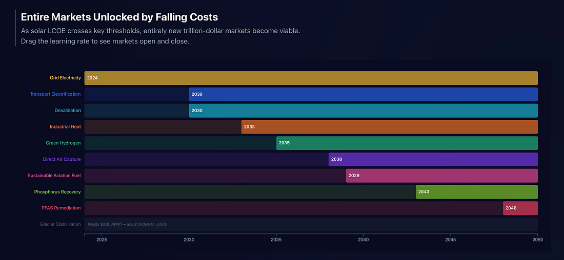 Radical optimismIn the week when oil crossed $100 a barrel and triggered the biggest oil shock in history, we published a radically optimistic analysis of the near future of energy. The world right now may feel like a place where the short run is gorging on the long run – and yet! there are forces that no political decision can eclipse. We argue that solar power could unlock a cascade of civilizational problems that cheap electricity can solve. Solar energy enjoys learning curves, cheaper with scale, while fossil fuels, for all their remarkable properties, face depletion curves. This is the solar supercycle, a self-reinforcing loop where every cost reduction opens a new market and every new market funds the next cost reduction. To show its potential, we built a model grounded in fifty years of Wright’s Law data that maps when each threshold arrives and which markets open up. The model allows you put put in your own assumptions: bearish, bullish or something in between. Paying members have had the model since Thursday. Today it opens to everyone: solar.exponentialview.co 🌞 An agentic nationChinese local governments are competing to normalise AI agent adoption. Around 1,000 people lined up outside Tencent’s headquarters to get OpenClaw installed last week. Paid installers appeared on Chinese consumer platforms almost immediately, charging for setup even though the software is free. Six major platforms pushed out hosted or one-click versions within days. Users from China make up nearly 40% of the 200,000 publicly visible OpenClaw agents.
