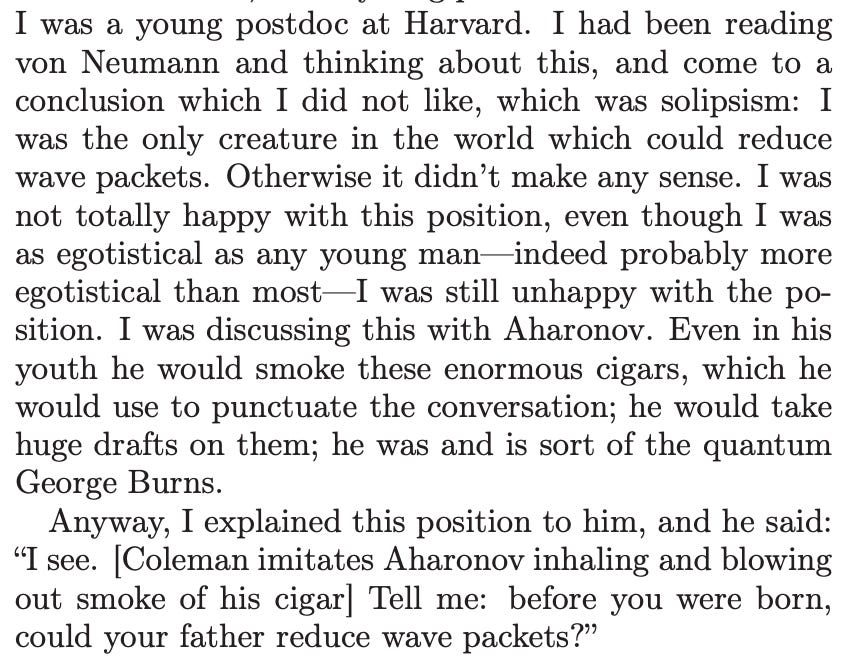 Now some, maybe all, self-adjoint operators are “observables”. If the state is an eigenstate of an observable A, with eigenvalue a, then we say the value of A is a, is certain to be observed to be a…. There’s an implicit promise… that the words “observes” and “observable” will… act… as those entities do in the language of everyday speech…. Now to show that is a long story. It’s not something I’m going to focus on here, involving things like the WKB approximation and von Neumann’s analysis of an ideal measuring device, but I just wanted to point out that that’s there…. Now we come to the fourth thing… the famous projection postulate… sometimes called “the reduction of the wave packet”. It’s very different from the previous three… on the board because it contradicts one of them: causal time evolution according to Schrödinger’s equation… <https://arxiv.org/pdf/2011.12671.pdf>