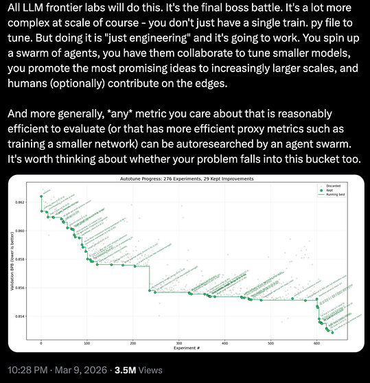 Jensen Huang says, “Every company needs an OpenClaw strategy.” What did he mean by that, and what does it mean for you? If you want me to brief your board on this or other topics, please get in touch here. I only have the capacity to help a select number of firms a year, and slots fill up fast. 🦞 🔮 Autoresearch and the experimental societyOn bringing the scientific method into everyday knowledge workScience is the most reliable method humanity has found for producing knowledge. It has also, for most of history, been expensive to run. Andrej Karpathy released 600 lines of Python code a few weeks ago that started to change that. His autoresearch (see EV#565) runs an autonomous experimental loop in which a human sets a strategic direction, defines what good looks like and the agent iterates towards success within the guardrails. In Andrej’s initial experiment, it trained a GPT-2-level model over two days, 11% faster and found 20 genuine improvements. Shortly after the release, Shopify’s CEO Toby Lütke used autoresearch on his company’s internal model, qmd; it ran 37 experiments overnight, so Toby woke up to a 0.8-billion-parameter model outscoring his previous 1.6-billion-parameter version by 19%. Toby is not a machine learning engineer. Autoresearch is powerful because it solves two problems at once. One, it automates part of the knowledge-production process. And two, it solves the agent control problem, meaning it keeps agents on task. AI often drifts if you give it an open-ended brief or optimize for the wrong thing. To my great joy, autoresearch prevents this by design. The human decides where the car is going; autoresearch keeps its hands on the wheel. I spent the last month adapting autoresearch for knowledge work beyond machine learning with the goal of spinning up a system that can run structured, low-cost experiments on the kinds of decisions most teams make every week. I’m calling this version AutoBeta, and I’m making the full playbook/skill available to paying members below. Let’s go! The measurement problemWhen I first saw autoresearch, my immediate reaction was that it didn’t have to be just about machine learning. The loop is generic – hypothesize, test, score, iterate. So I cloned it and started running it on other bits of my work. It didn’t go exactly as I expected. The outputs looked fine but I couldn’t tell whether they were getting better. Unlike ML where the agent has a built-in feedback signal from each training run, knowledge work was missing it. A pricing decision doesn’t validate in five minutes; and the paragraphs I write don’t tell me if the argument is getting better or just changing, most of the time. This is what makes applying autoresearch to knowledge work genuinely hard. The loop needs something to optimize against, and in knowledge work, that something doesn’t exist naturally. So I constructed a version of autoresearch, called AutoBeta, that works across a wide range of business problems. It is not as technically robust as Karpathy’s, but it has the same design principles: I set the objective and the constraints, the experimentation takes place within the loop. The one thing I changed was the score. I created “an oracle”, a panel of synthetic judges scoring each output against pre-defined criteria, collapsed into a single number the loop can optimize for. ... Subscribe to Exponential View to unlock the rest.Become a paying subscriber of Exponential View to get access to this post and other subscriber-only content. A subscription gets you: